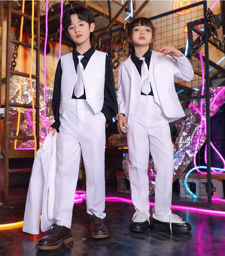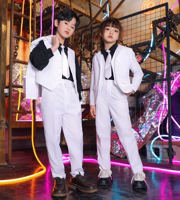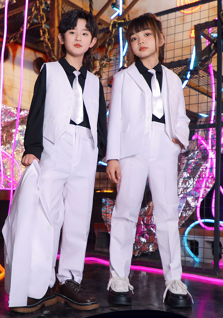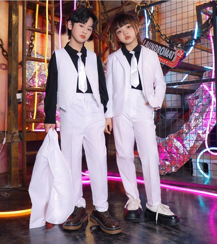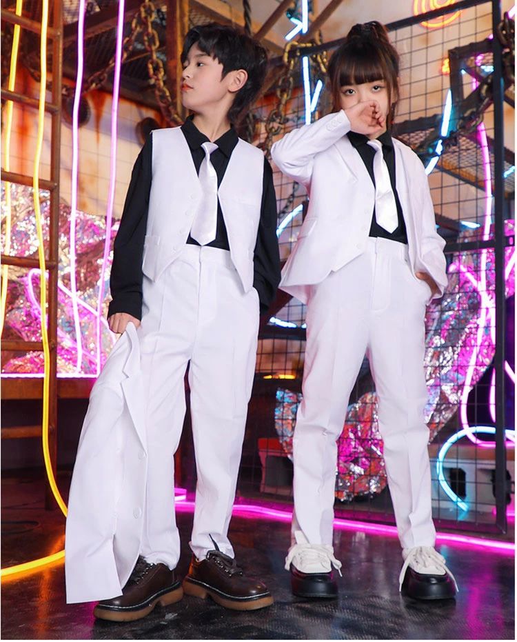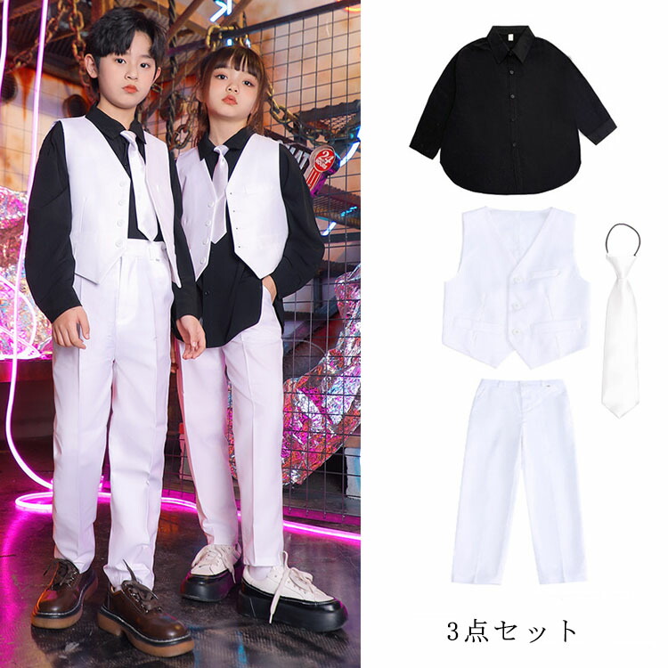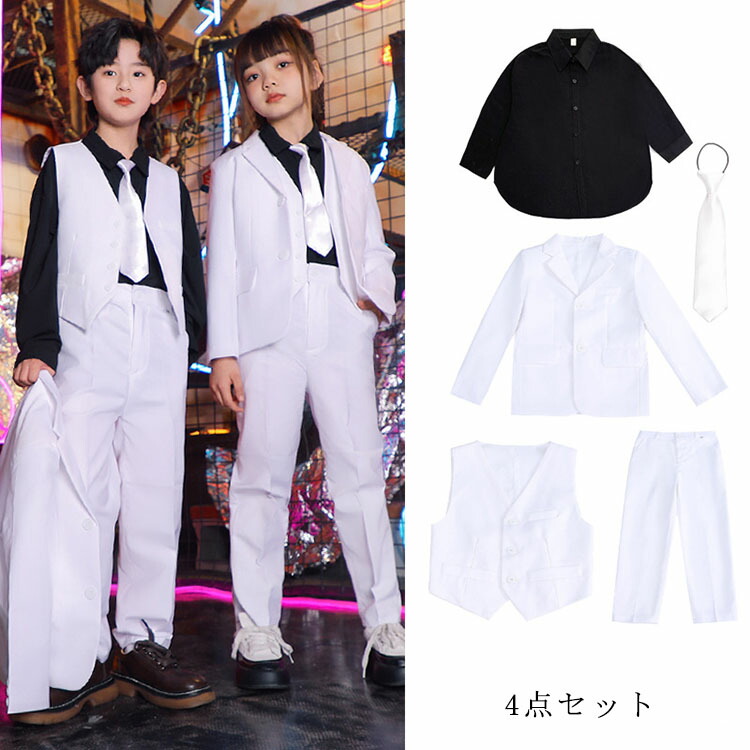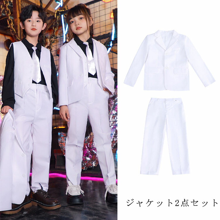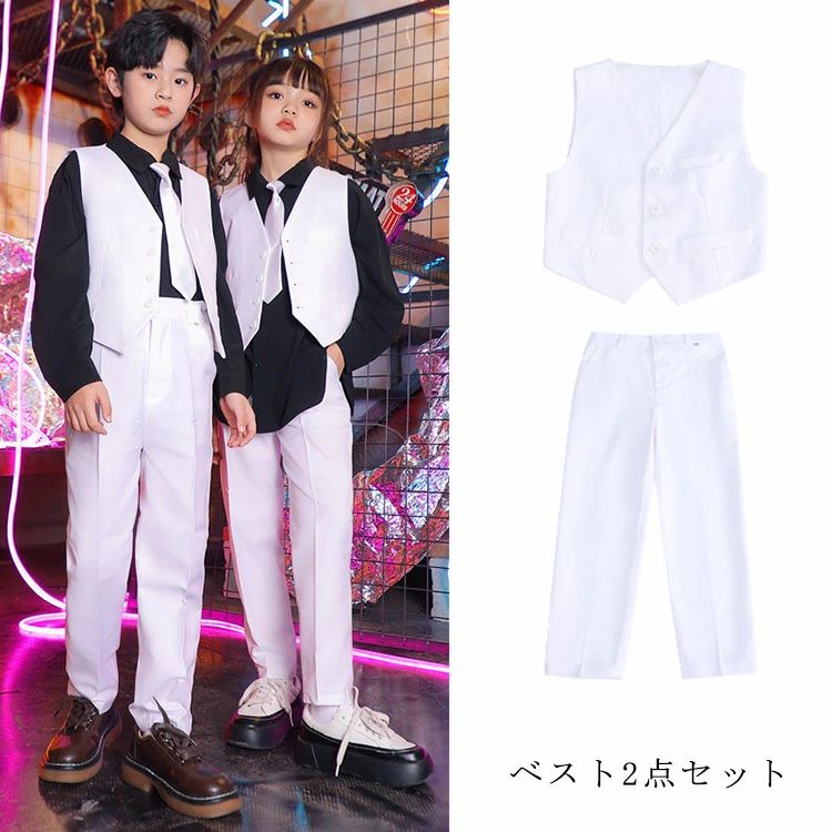 キッズダンス衣装 白 ダンススーツ ホワイト ベスト ジャケット パンツ 黒ブラウス ネクタイ付き 韓国 k-pop衣装 男の子 女の子 ピアノ発表会 パンツスーツ 卒業式 ヒップホップ ジャ