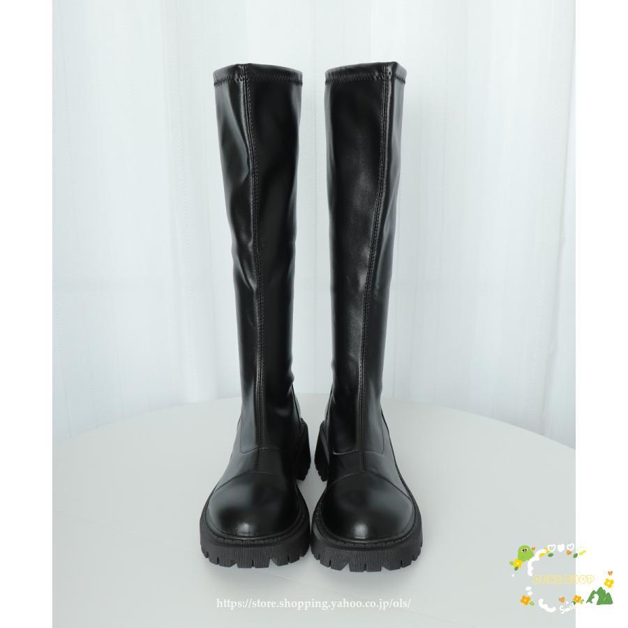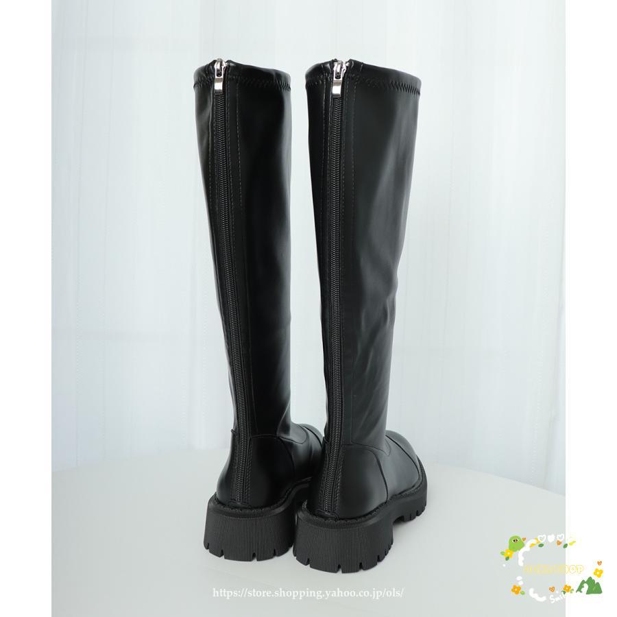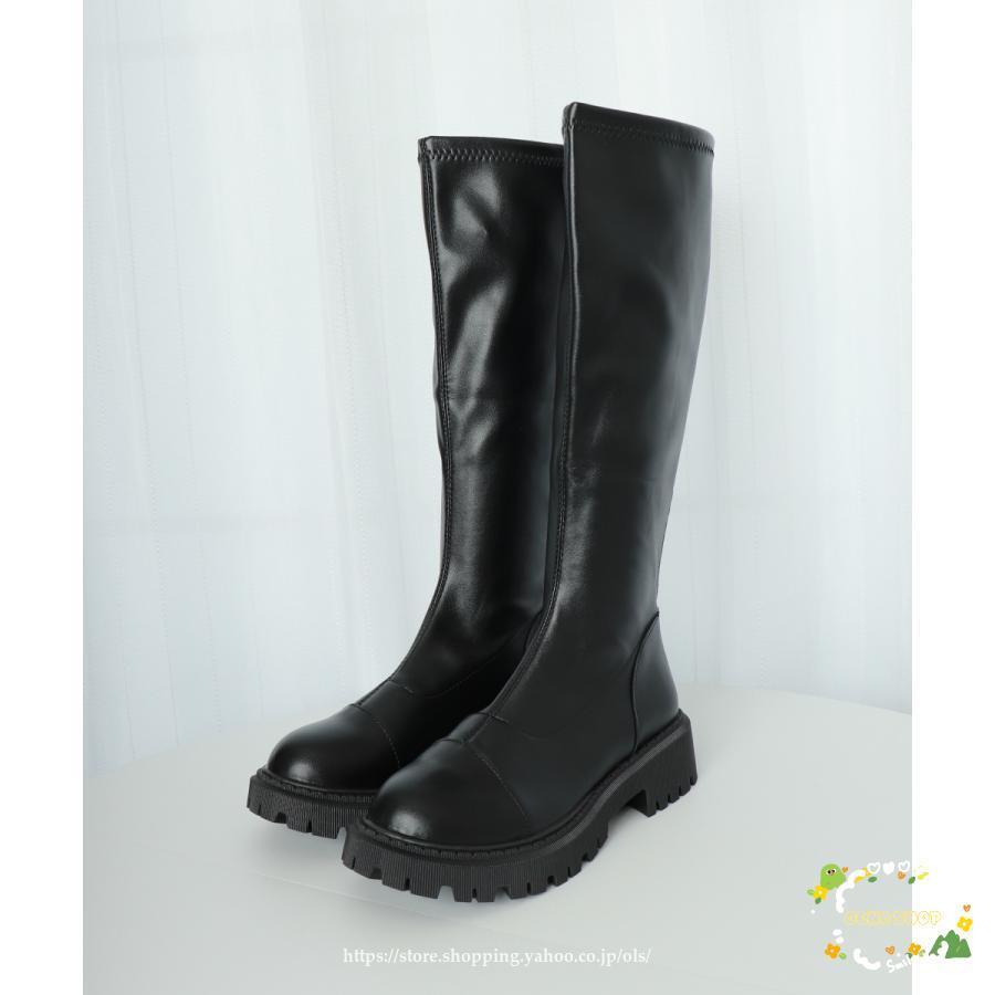 レディース 韓国ブーツ 膝下 ジョッキーブーツ バックジップ PUブーツ 太ヒール 靴 履きやすい 春秋冬 新作