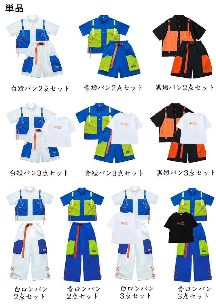 商品内容: 白Tシャツのみ 黒Tシャツのみ 白×青トップスのみ 青×緑トップスのみ 黒×橙トップスのみ 白×青パンツのみ 青×緑パンツのみ 黒×橙パンツのみ 白短パン2点セット 青短パン2点セット 黒短パン2点セット 白短パン3点セット 青短パン3点セット 黒短パン3点セット 白ロンパン2点セット 青ロンパン2点セット 白ロンパン3点セット 青ロンパン3点セット