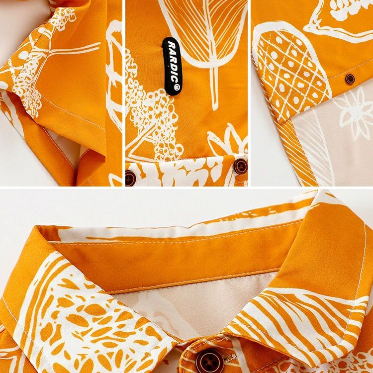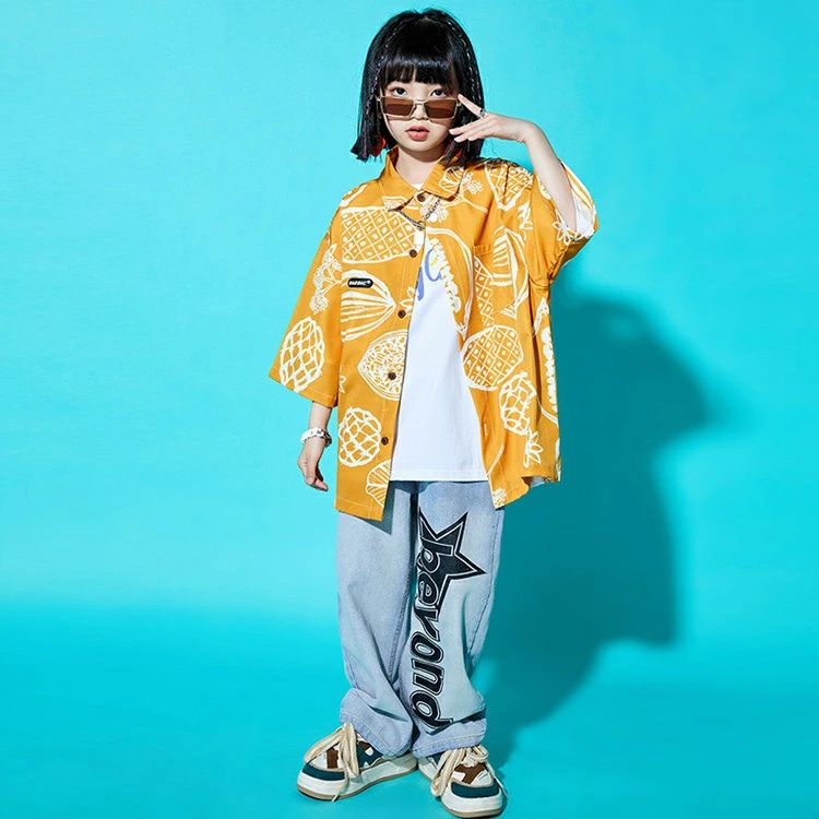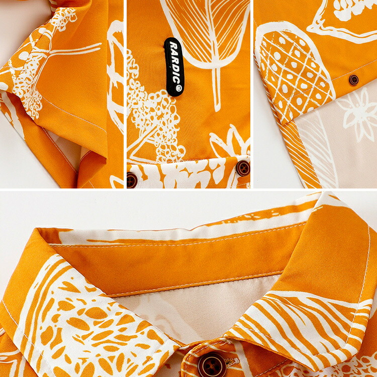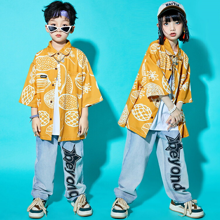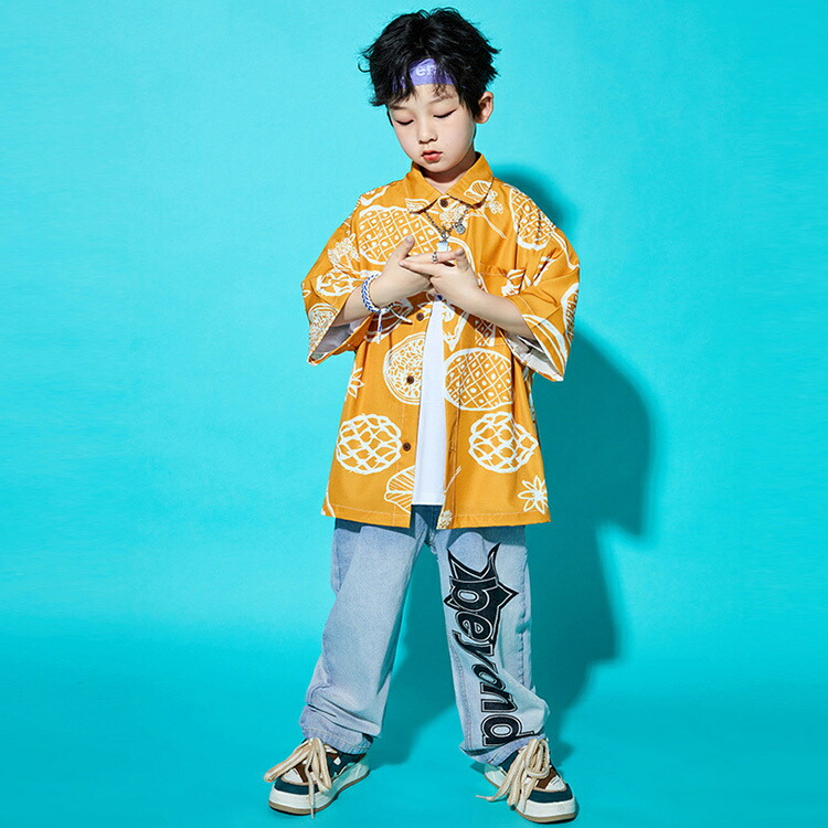 柄シャツ イエロー 黄色 デニムパンツ