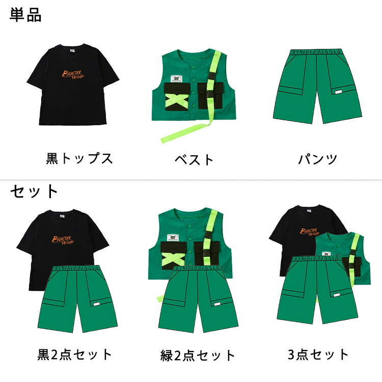 商品内容: 黒トップスのみ ベストのみ パンツのみ 黒2点セット 緑2点セット 3点セット