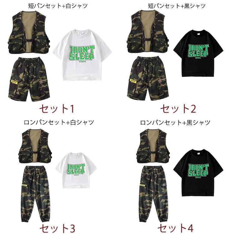商品内容: ベスト+短パン ベスト+ロンパン セット1 セット2 セット3 セット4 迷彩ベスト 迷彩短パン 迷彩ロンパン 白シャツ 黒シャツ