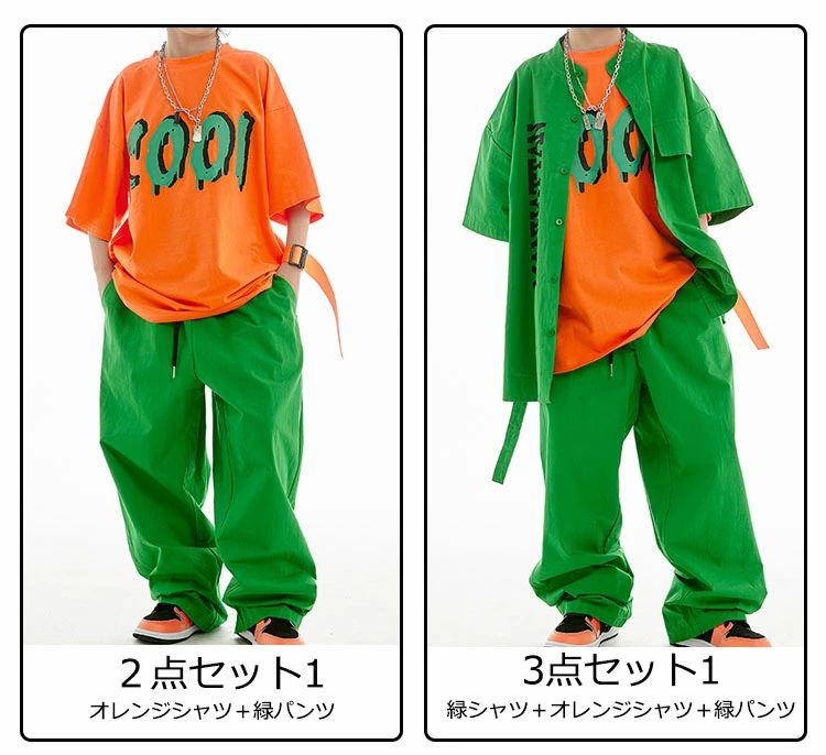 商品内容:: オレンジシャツ グリーンシャツ 緑パンツ 黒パンツ 2点セット1 3点セット1 2点セット2 3点セット2 緑シャツ+緑パンツ 緑シャツ+黒パンツ
