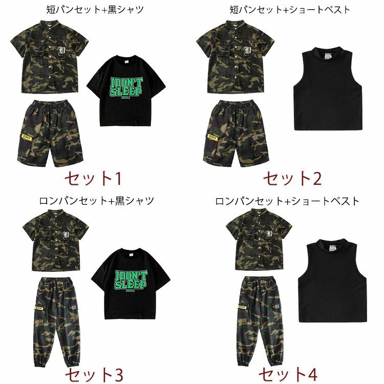 商品内容: 迷彩シャツ+短パン 迷彩シャツ+ロンパン セット1 セット2 セット3 セット4 黒シャツのみ 迷彩シャツのみ 黒ショートトップのみ 迷彩短パン 迷彩ロンパン