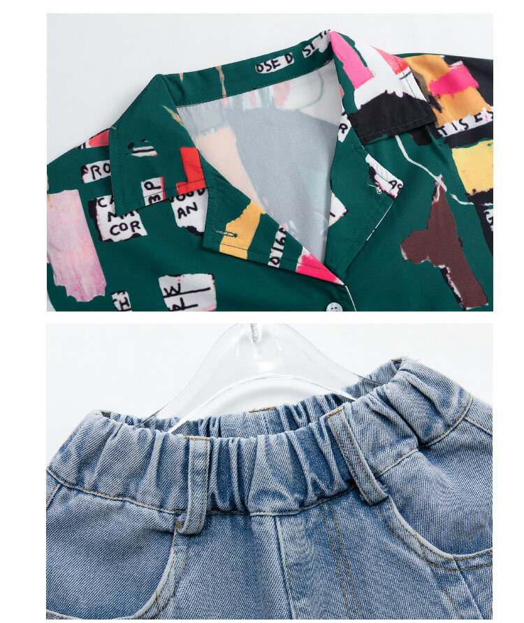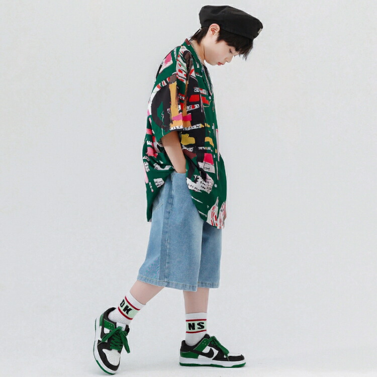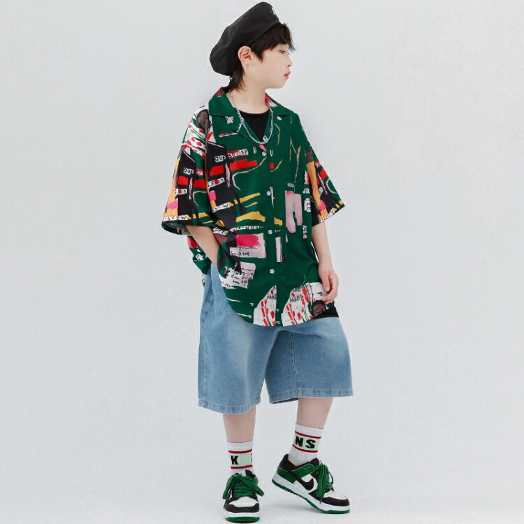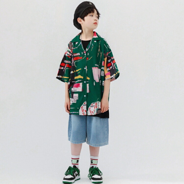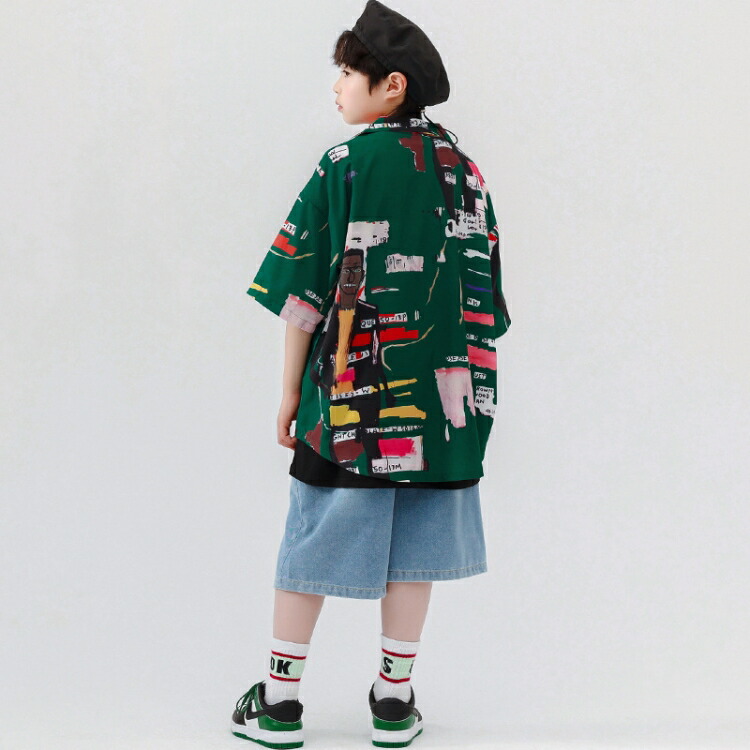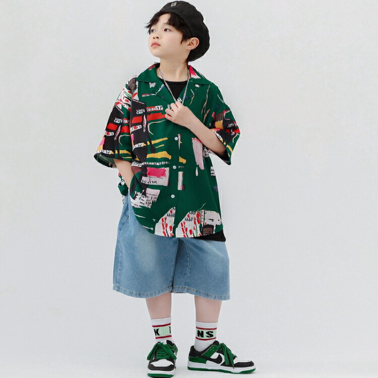 緑色 柄シャツ 総柄 半袖 シャツ カ