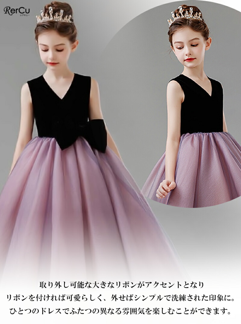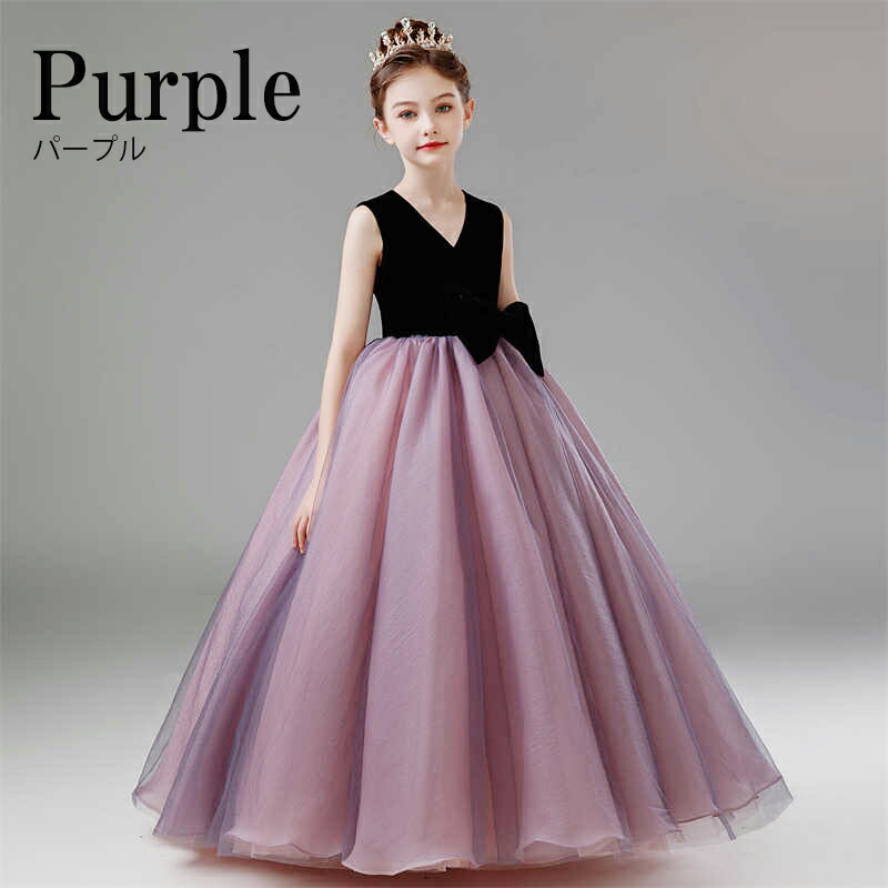 子どもドレス 子供 ロングドレス キッズドレス 高級ドレス 子供 シンプル 上品 フォーマル フラワーガール 華やか 輝き エレガント 豪華 パープル 120 130 140 150 160 Vネック