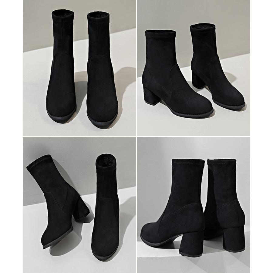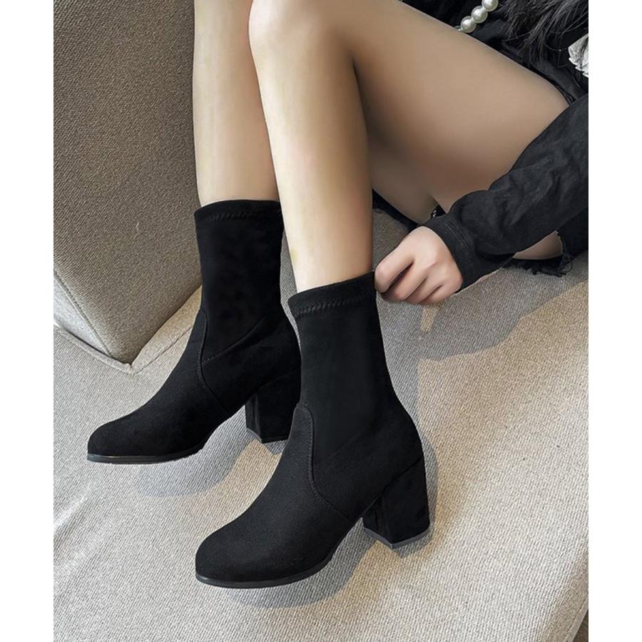 おしゃれ ストレッチブーツ チャンキーヒール レディース 美脚ブーティ ラウンドトゥミドルブーツ 黒 通勤 歩きやすい靴
