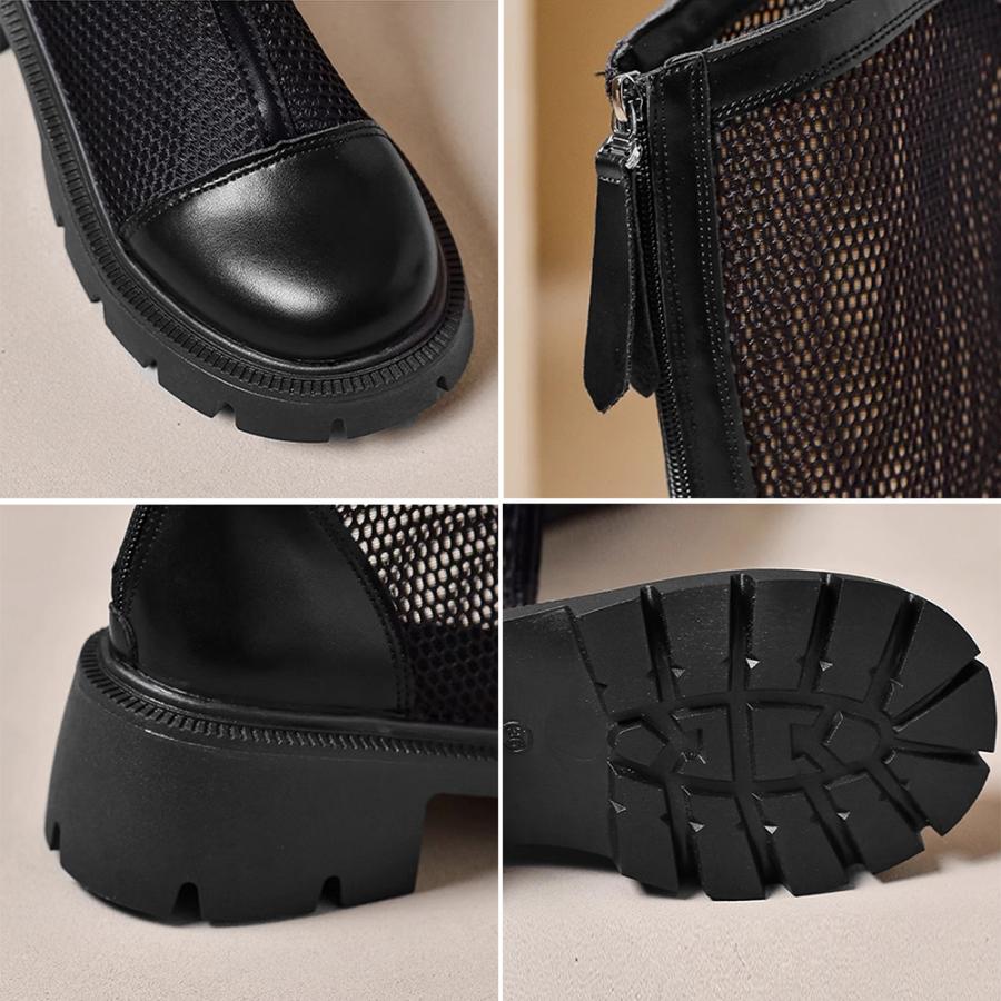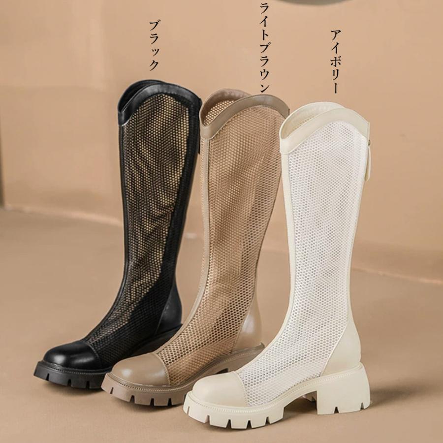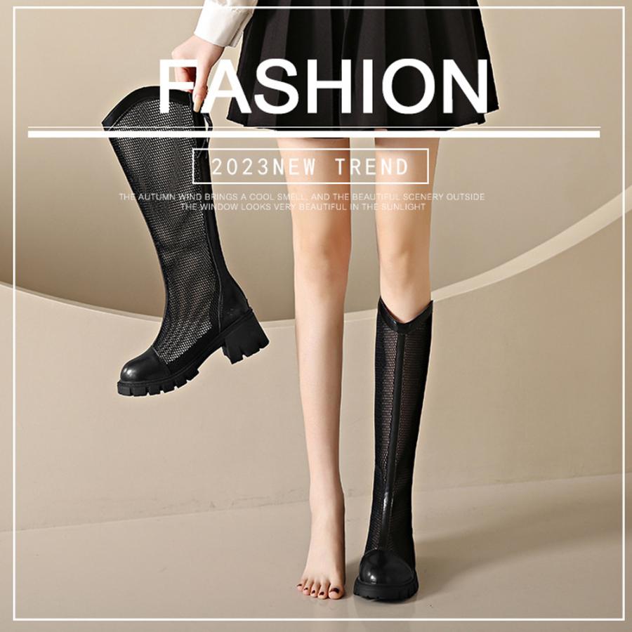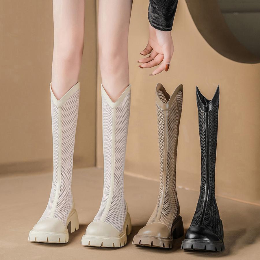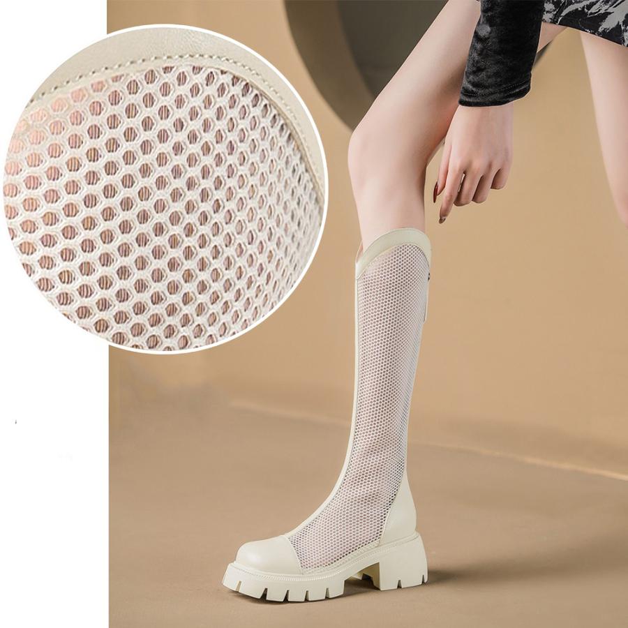 蒸れない サマーブーツ 韓国レディース 通気性美脚ロングブーツ 厚底 5cmヒール ブーツサンダル ローヒールカジュアル