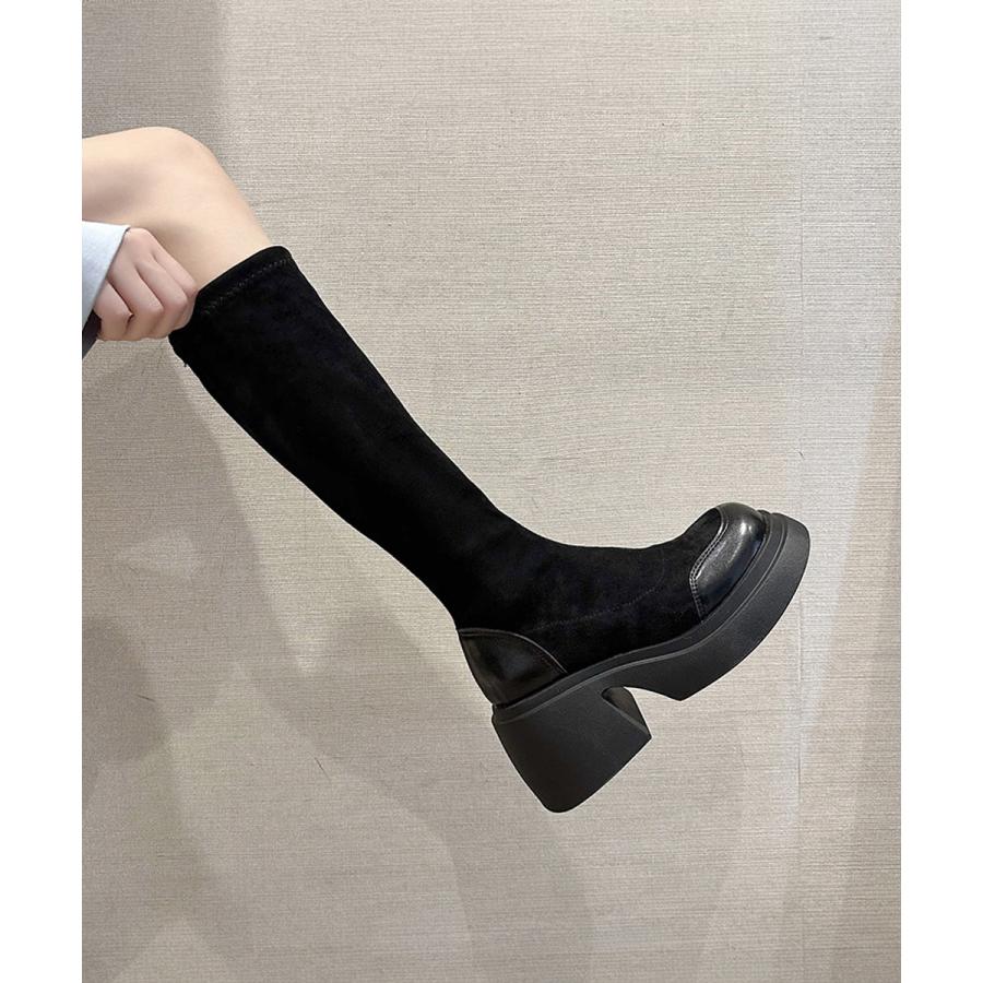 異素材をミックスして個性溢れるデザインの厚底ロングブーツ。