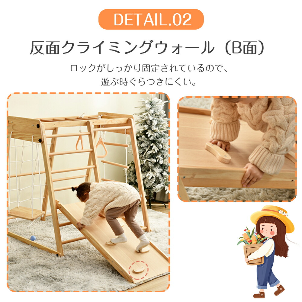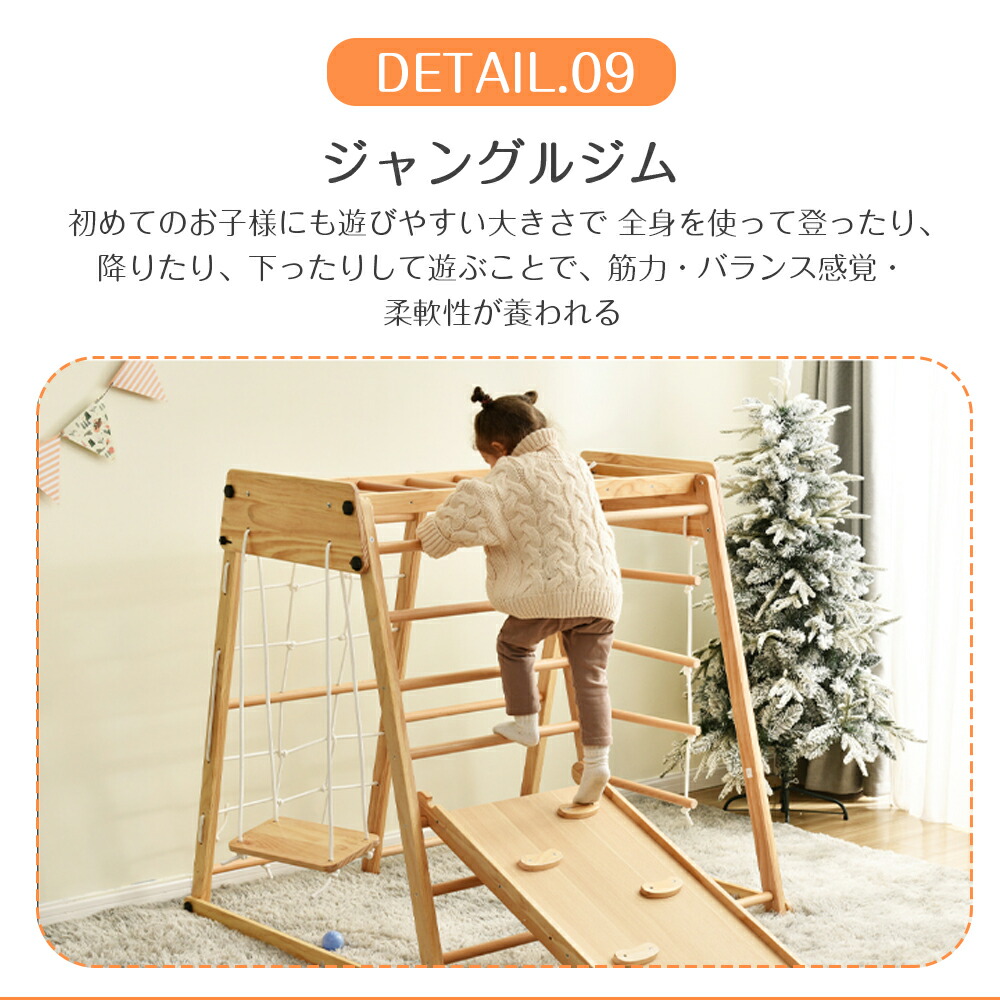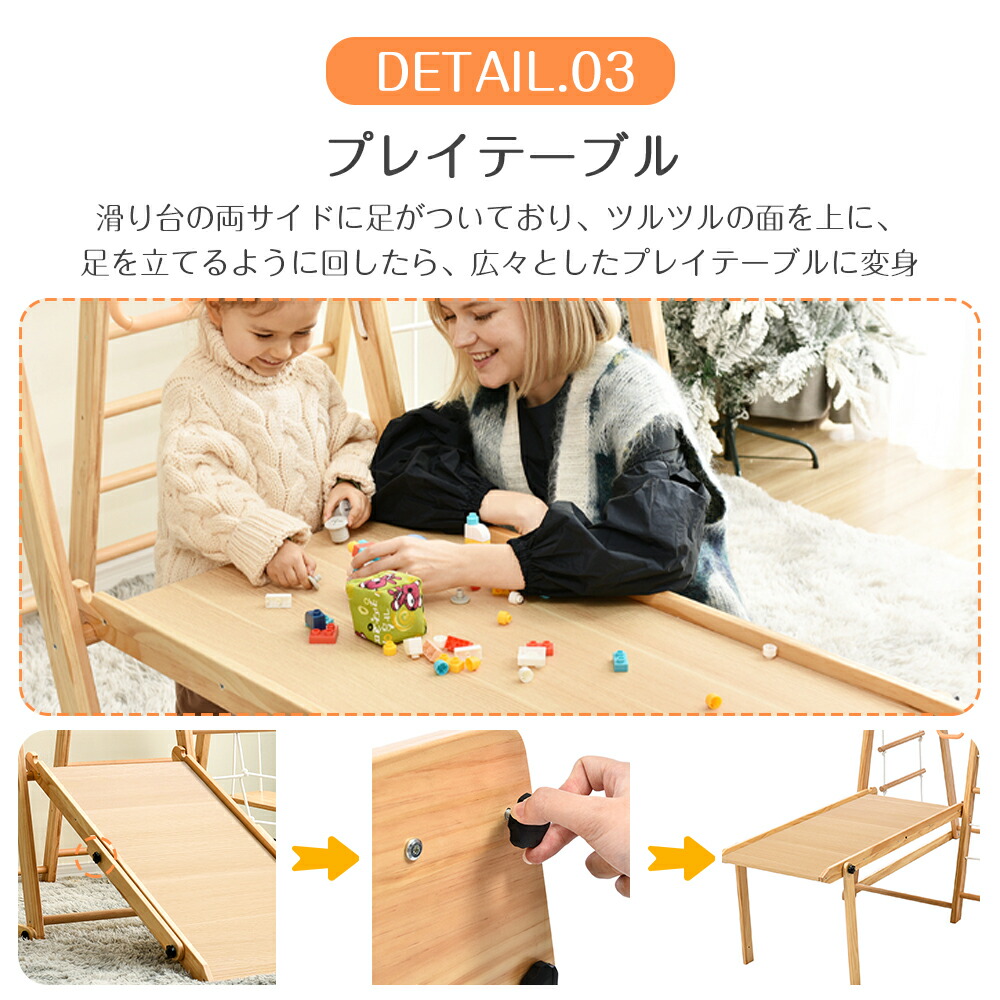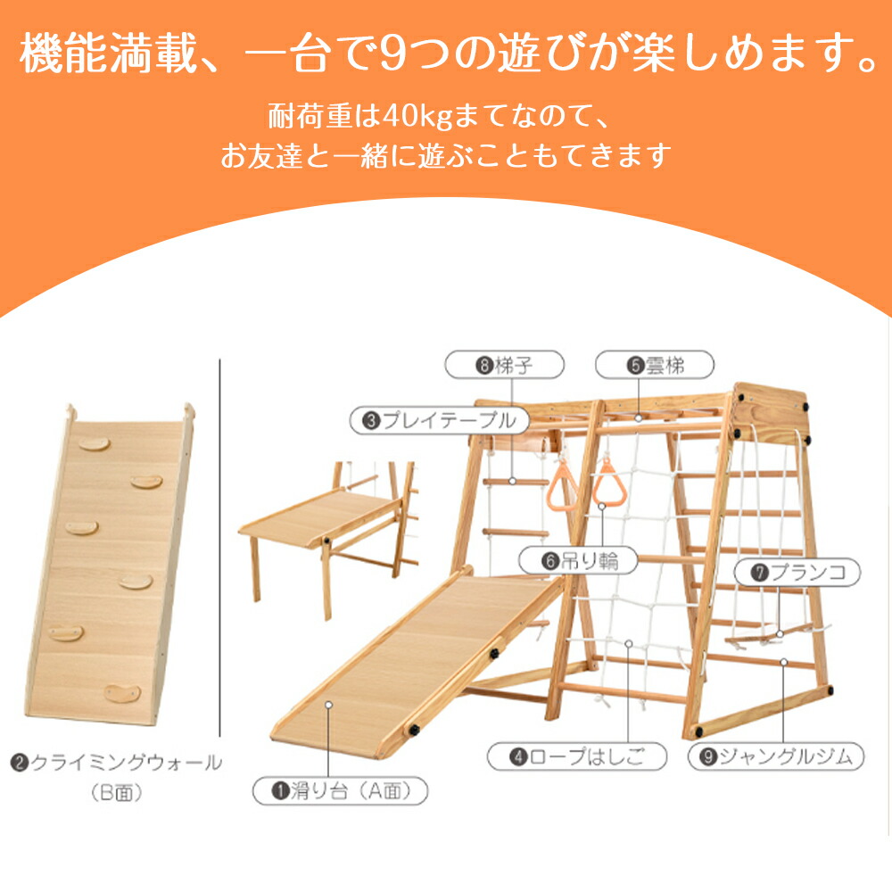 1-3日発送(休日を除く)、遠隔地は追加運賃が必要(沖縄離島地域+1440)POINT 1.【1台で9役♪】 ♪機能満載 滑り台(A面) クライミングウォール(B面) プレイテーブル ロープはしご 雲梯 吊り輪 ブランコ 梯子 ジャングルジム ▼ ♪DETAIL.01 ▼ ツルツル滑り台(A面) 両面使える多機能滑り台♪ 厚みのある板材で作られたため、安定感がある けがをしないように、安心安全の角取り加工 素材は同じですが、実物の木目が横になるので、予めご了承ください。 DETAIL.02 ▼ 反面クライミングウォール(B面) ロックがしっかり固定されているので、遊ぶ時ぐらつきにくい。 ♪DETAIL.03 ▼ プレイテーブル サイドに脚 アジャストを緩めて調整 完成 滑り台の両サイドに足がついており、ツルツルの面を上に、足を立てるように回したら、広々としたプレイテーブルに変身! DETAIL.04 ▼ ロープ梯子 はしごを上ることで、お子様の筋力、柔軟性と体のバランスが鍛えられるDETAIL.05 ▼ 雲梯 ぶら下がることで、腕力がついたり、背筋や下半身が伸びたりする 下から上の場合、足の筋力、ジャンプ力と瞬発力がアップするので全身が鍛えられる DETAIL.06 ▼ 吊り輪 背伸びを助けてくれる! 耐久性の高いプラスチックを使用したため、長くお使えいただける 滑り防止にもなる柔らかいゴムで包んでいるので、安心安全にご使用可能 DETAIL.07 ▼ ブランコ 安全面を考慮し、最高の強度と耐久力耐候性耐水性も抜群のナイロンロープを使用している ロープを結ぶだけで簡単に設置できる DETAIL.08 ▼ 梯子 登ったり降りたりして 全身運動 DETAIL.09 ▼ ジャングルジム 初めてのお子様にも遊びやすい大きさで 全身を使って登ったり、降りたり、下ったりして遊ぶことで、筋力バランス感覚柔軟性が養われるPOINT 2.【折りたたみ収納 】必要な時だけ、サッと広げで遊ぶ 普段は折り畳んで、省スペースに収納可能 おうちの空間を最大限に活用 来客時の邪魔にならないPOINT 3.【天然木素材を使用】欅棒(丸い手すり)と松木のプレームで仕上げたため、非常に頑丈で変形しにくい! 木材は安心の無着色 木目が綺麗でおうちのインテリアにも馴染みやすいPOINT 4.【お子様が安全に遊べるように、細かいところまで配慮】 安心安全な塗料 塗装には安全性テストに合格した透明ワニスを採用し、健康に悪い影響がないことに心掛けています。 全体丸角加工 遊んでるうちにけがをしないように、角をすべて丸く加工しており、また、表面もツルツルに磨いているので安全性を最大限高めました。 表面をツルツルに 木材を何度も磨き重ねてツルツルに仕上げたので、感触がよくて、ザラザラでけがをする心配もない 耐荷重について 商品の耐荷重:50kg 吊り輪の耐荷重:35kg ブランコの耐荷重:35kg 丸い棒の耐荷重:35kg プレイテーブルはおもちゃなどだけ置けます。予めご了承ください。