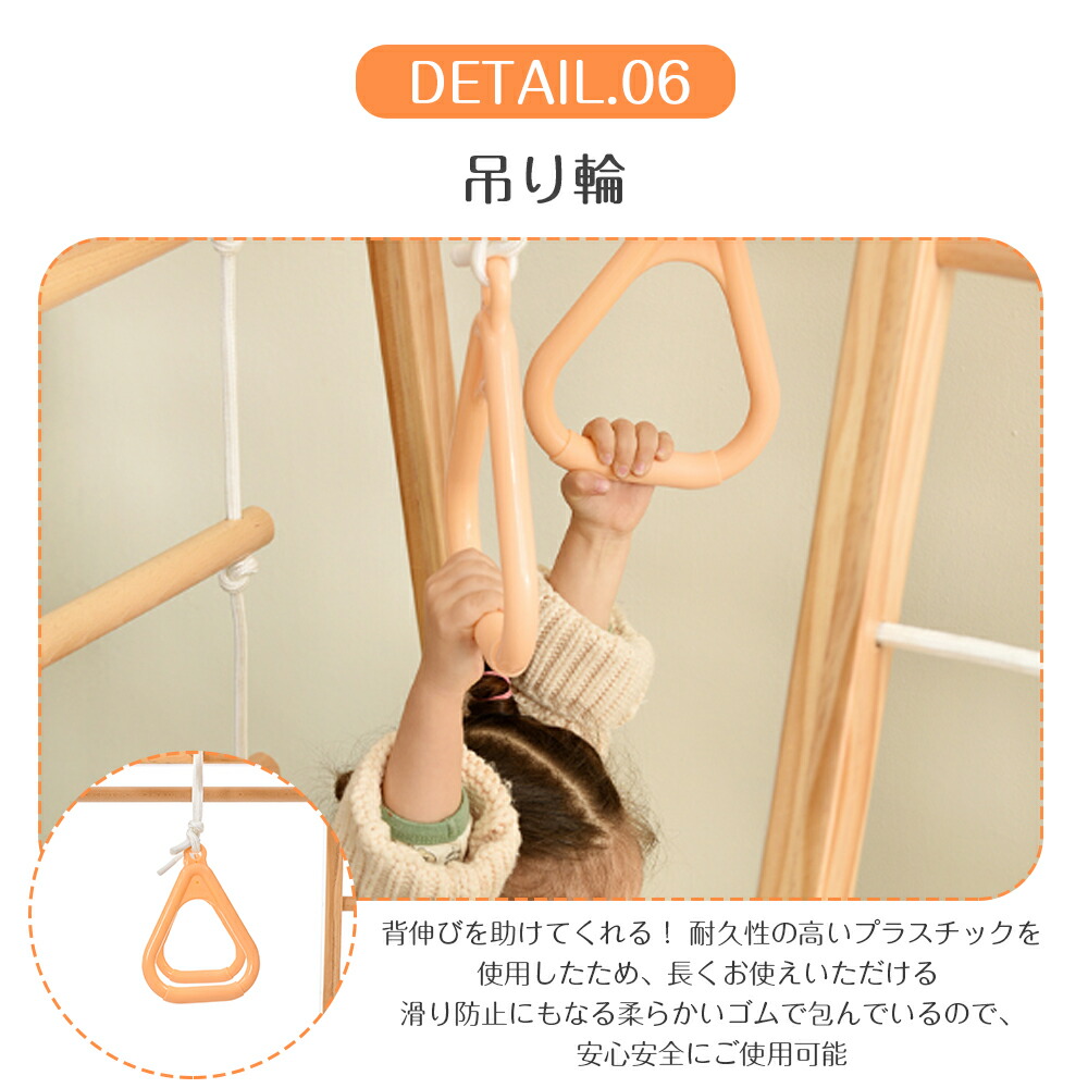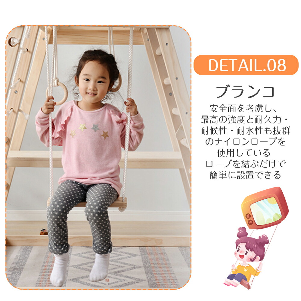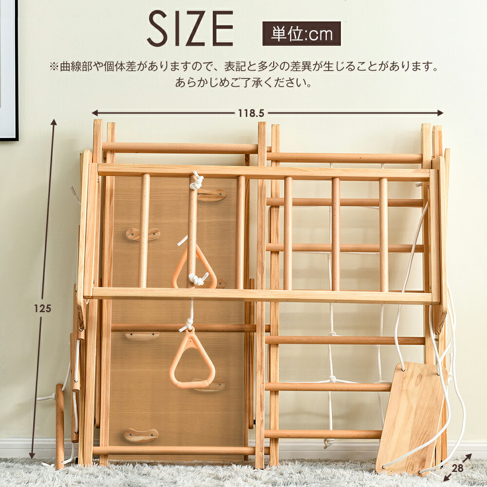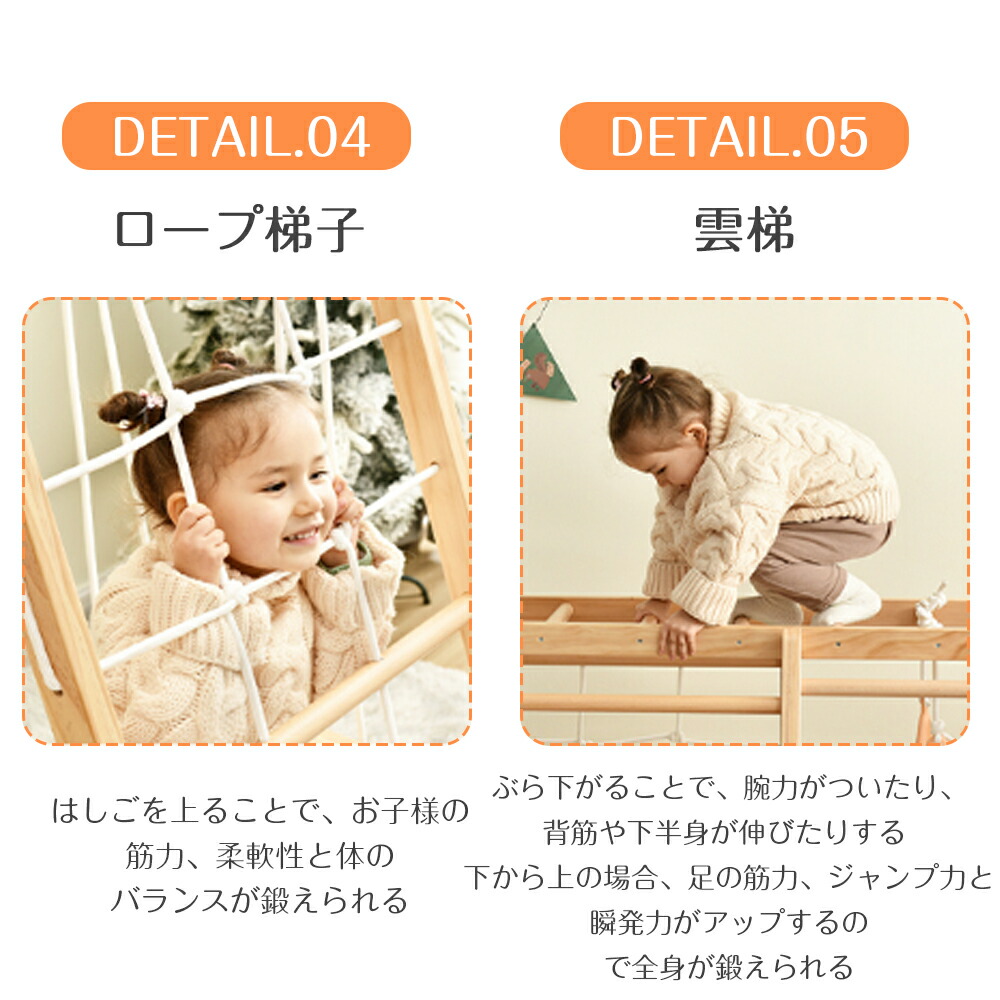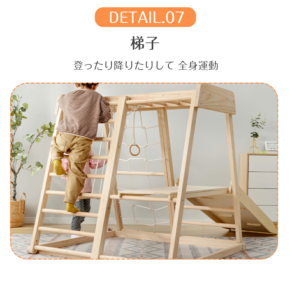 1-3日発送(休日を除く)、遠隔地は追加運賃が必要(沖縄離島地域+1440)POINT 1.【1台で9役♪】 ♪機能満載 滑り台(A面) クライミングウォール(B面) プレイテーブル ロープはしご 雲梯 吊り輪 ブランコ 梯子 ジャングルジム ▼ ♪DETAIL.01 ▼ ツルツル滑り台(A面) 両面使える多機能滑り台♪ 厚みのある板材で作られたため、安定感がある けがをしないように、安心安全の角取り加工 素材は同じですが、実物の木目が横になるので、予めご了承ください。 DETAIL.02 ▼ 反面クライミングウォール(B面) ロックがしっかり固定されているので、遊ぶ時ぐらつきにくい。 ♪DETAIL.03 ▼ プレイテーブル サイドに脚 アジャストを緩めて調整 完成 滑り台の両サイドに足がついており、ツルツルの面を上に、足を立てるように回したら、広々としたプレイテーブルに変身! DETAIL.04 ▼ ロープ梯子 はしごを上ることで、お子様の筋力、柔軟性と体のバランスが鍛えられるDETAIL.05 ▼ 雲梯 ぶら下がることで、腕力がついたり、背筋や下半身が伸びたりする 下から上の場合、足の筋力、ジャンプ力と瞬発力がアップするので全身が鍛えられる DETAIL.06 ▼ 吊り輪 背伸びを助けてくれる! 耐久性の高いプラスチックを使用したため、長くお使えいただける 滑り防止にもなる柔らかいゴムで包んでいるので、安心安全にご使用可能 DETAIL.07 ▼ ブランコ 安全面を考慮し、最高の強度と耐久力耐候性耐水性も抜群のナイロンロープを使用している ロープを結ぶだけで簡単に設置できる DETAIL.08 ▼ 梯子 登ったり降りたりして 全身運動 DETAIL.09 ▼ ジャングルジム 初めてのお子様にも遊びやすい大きさで 全身を使って登ったり、降りたり、下ったりして遊ぶことで、筋力バランス感覚柔軟性が養われるPOINT 2.【折りたたみ収納 】必要な時だけ、サッと広げで遊ぶ 普段は折り畳んで、省スペースに収納可能 おうちの空間を最大限に活用 来客時の邪魔にならないPOINT 3.【天然木素材を使用】欅棒(丸い手すり)と松木のプレームで仕上げたため、非常に頑丈で変形しにくい! 木材は安心の無着色 木目が綺麗でおうちのインテリアにも馴染みやすいPOINT 4.【お子様が安全に遊べるように、細かいところまで配慮】 安心安全な塗料 塗装には安全性テストに合格した透明ワニスを採用し、健康に悪い影響がないことに心掛けています。 全体丸角加工 遊んでるうちにけがをしないように、角をすべて丸く加工しており、また、表面もツルツルに磨いているので安全性を最大限高めました。 表面をツルツルに 木材を何度も磨き重ねてツルツルに仕上げたので、感触がよくて、ザラザラでけがをする心配もない 耐荷重について 商品の耐荷重:50kg 吊り輪の耐荷重:35kg ブランコの耐荷重:35kg 丸い棒の耐荷重:35kg プレイテーブルはおもちゃなどだけ置けます。予めご了承ください。