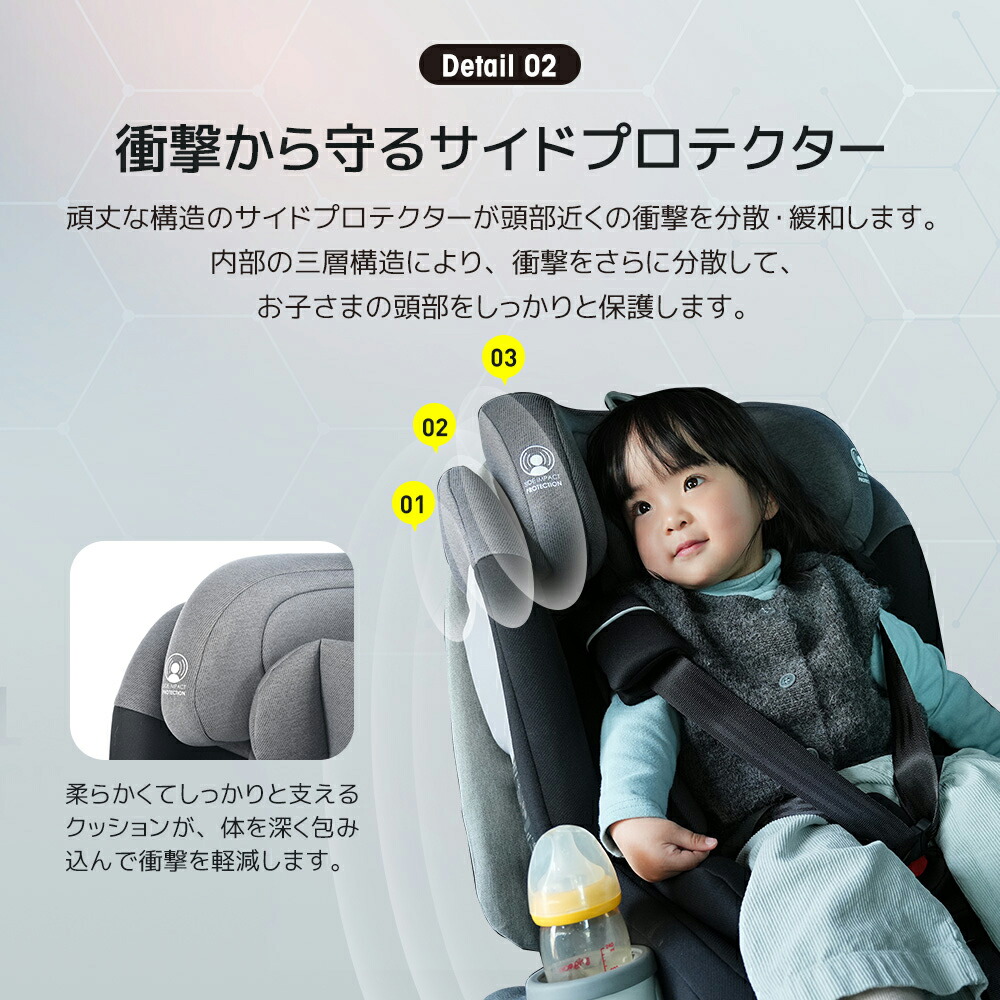 02衝撃からの確かな保護 両サイドにサイドインパクトシールドパネルを搭載し、万が一の事故時にも、柔らかいでしっかり支えたクッションに深く包み込んで、体への衝撃も軽減できます。イドからの衝撃からお子様を確実に保護できます。