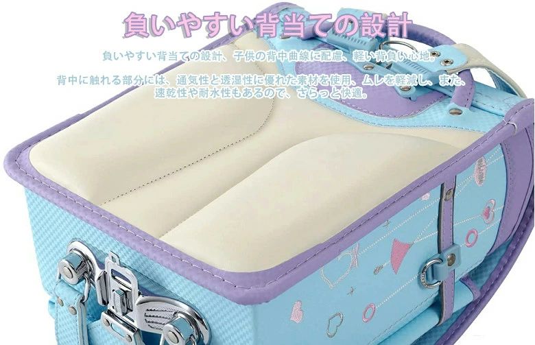 背負い込みやすいデザインで、子供の背中に配慮したカーブ、軽い背負い込み感。背中に触れる部分には、通気性と透湿性に優れた素材を使用しているので、摩擦を軽減し、また、速乾性と耐水性もあり、サラサラで快適