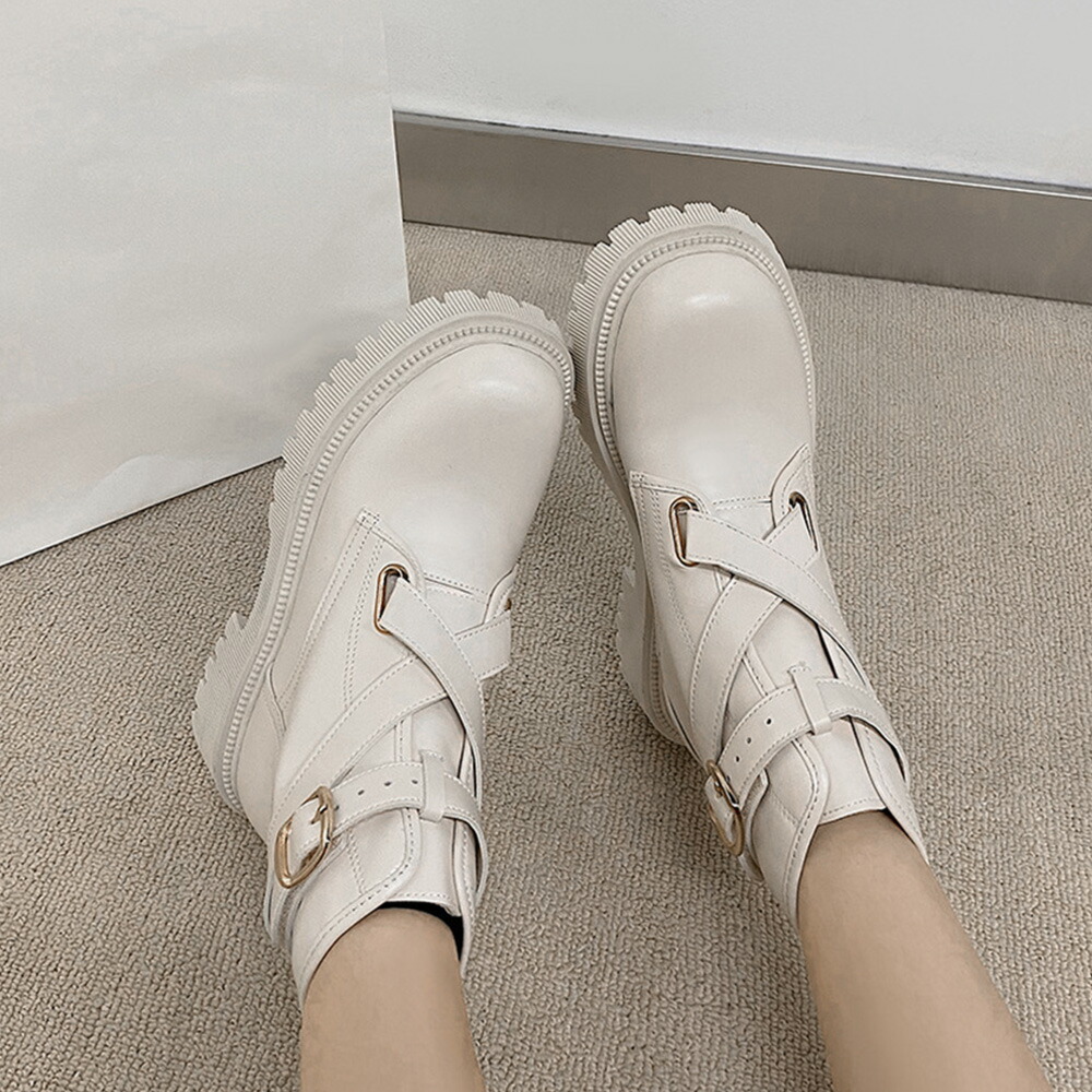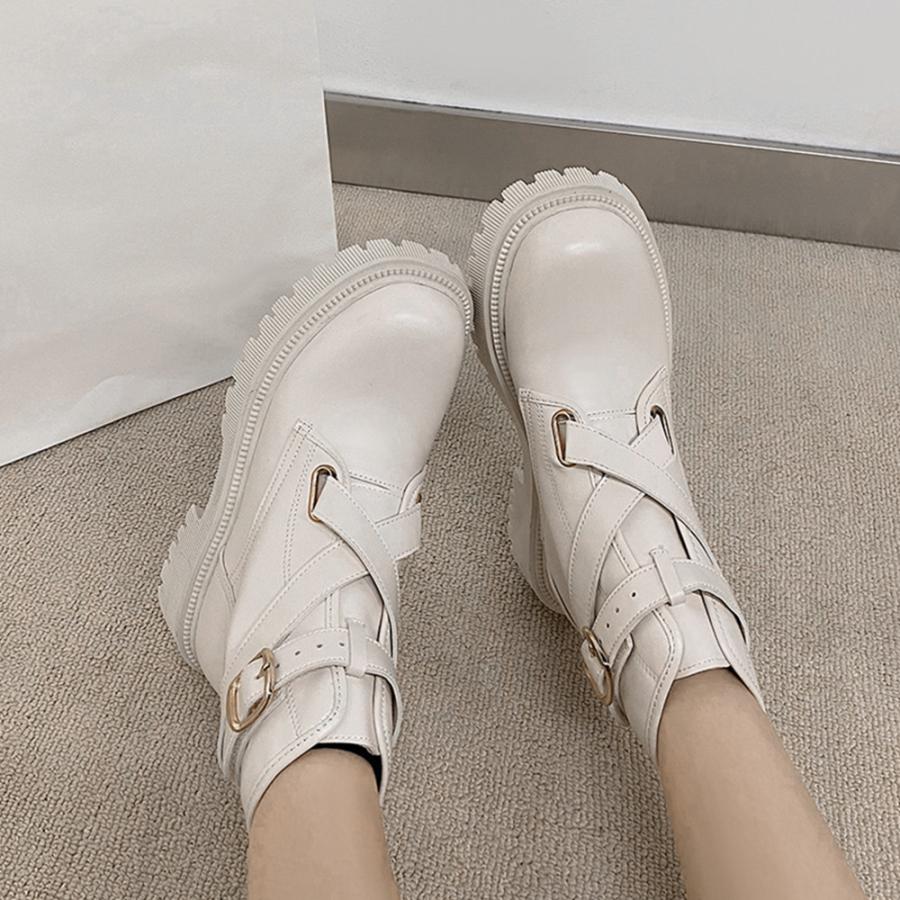 エンジニア風のメンズライクな表情に、クロスさせたダブルベルトとラウンドトゥで女性らしさをさりげなく高めたショートブーツ