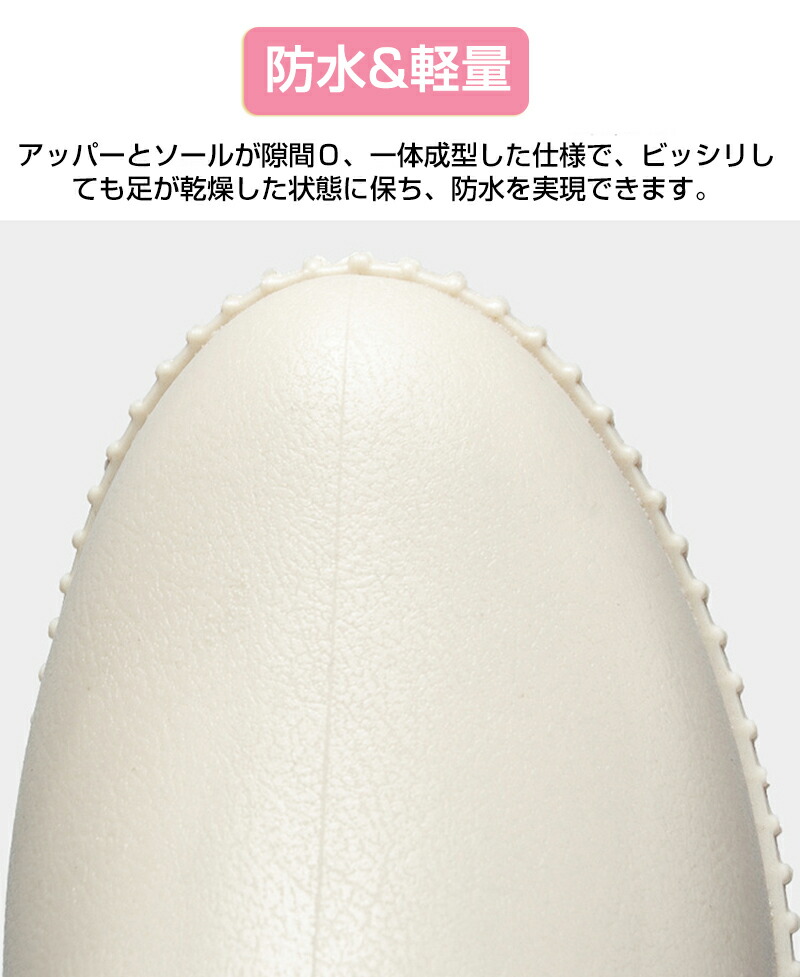 アッパーとソールが隙間0、一体成型した仕様で、ビッシリしても足が乾燥した状態に保ち、防水を実現できます。