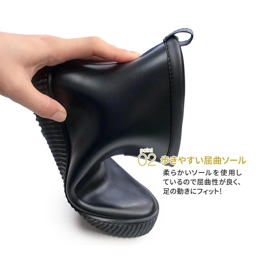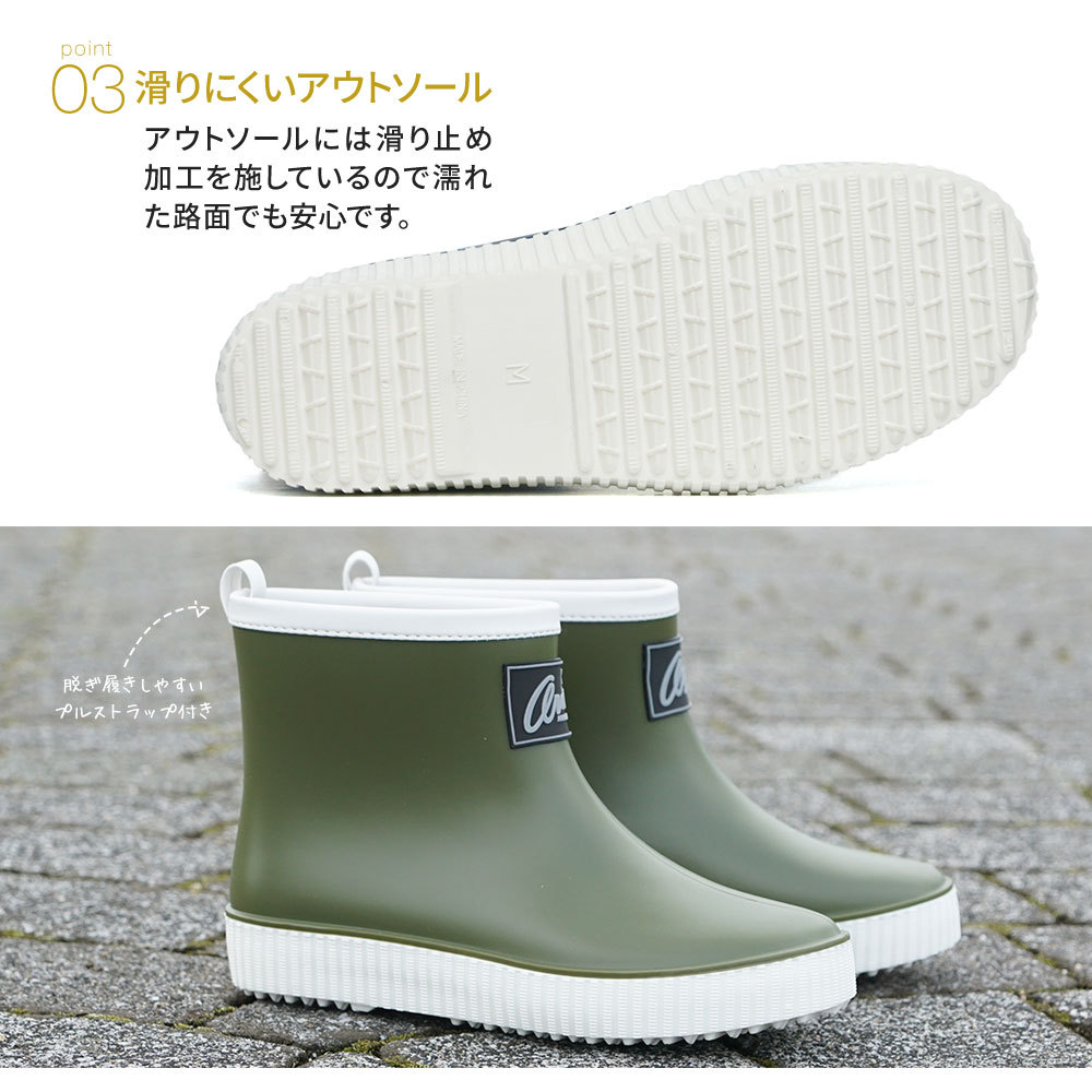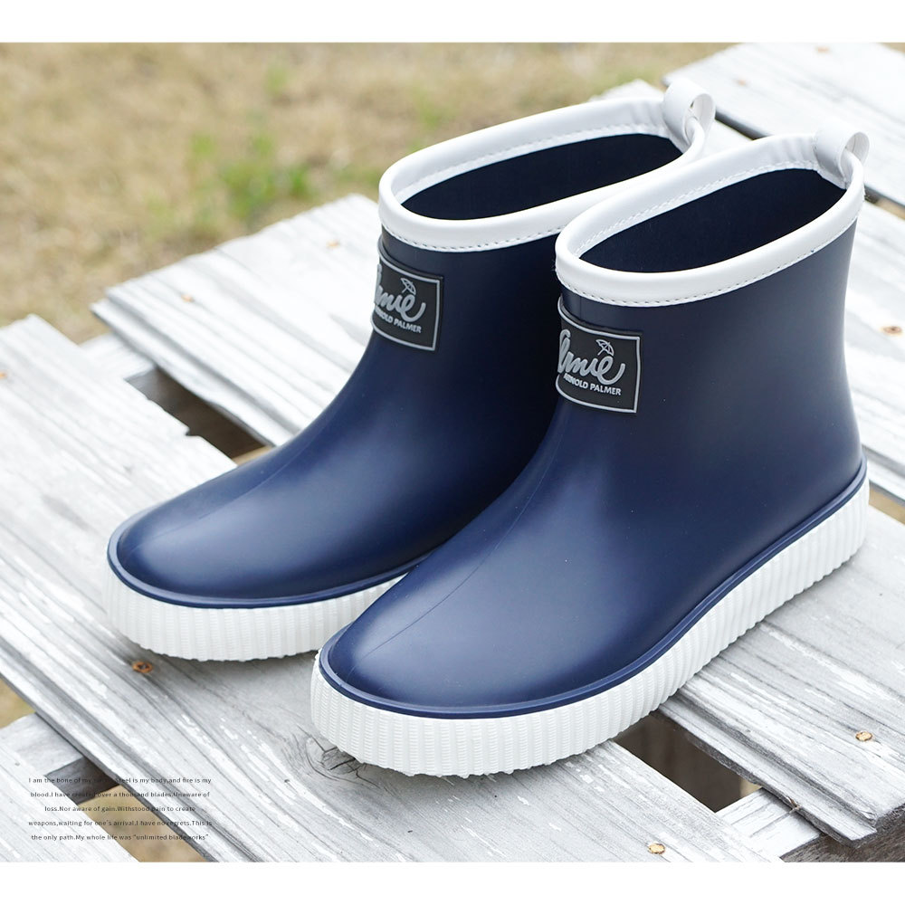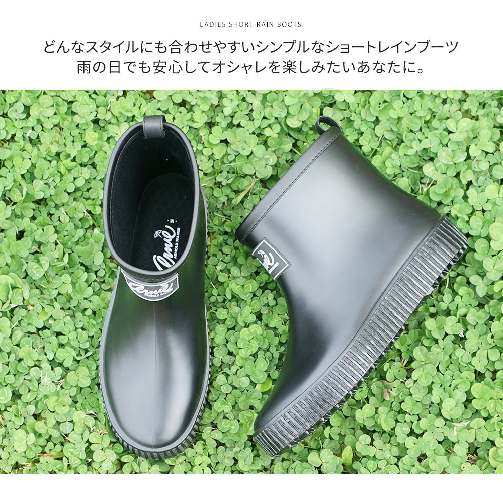 どんなスタイルにも合わせやすいシンプルなショートレインブーツです。