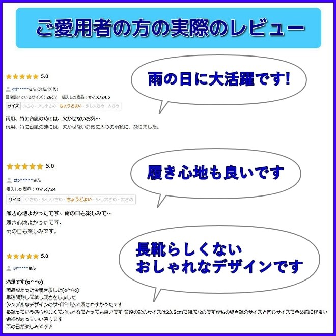 その他商品説明本体は優れた撥水性素材を使用しております。 ブーツのソール部分は滑り止め付きですので、足元の悪い雨道・雪道でも滑りにくく安心です。