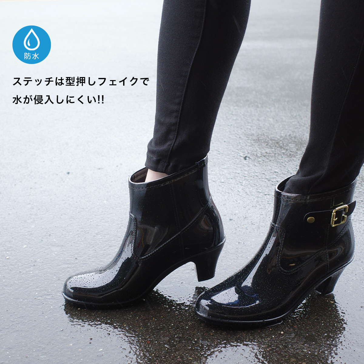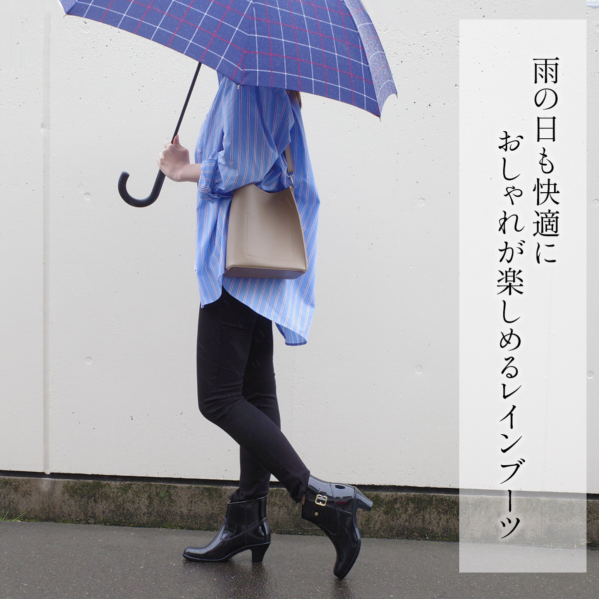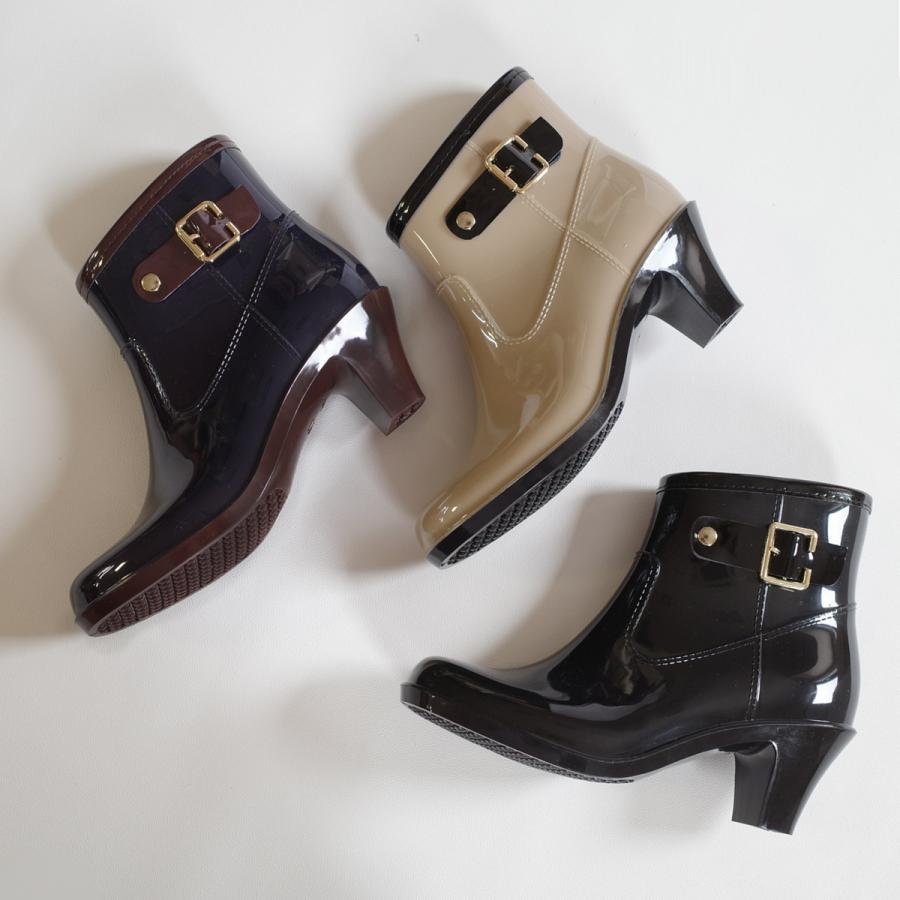 程よい高さのヒール、ベルトデザインで雨の日もオシャレに出かけられるアイテムです。