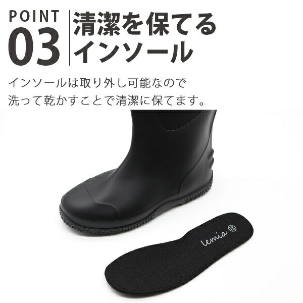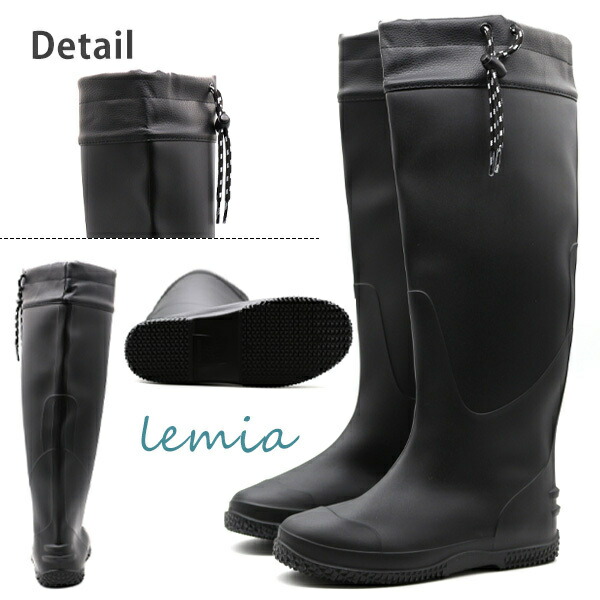 ブランド:Lemia レミア 商品名/品番:RM-0800 素材:アッパー:PVC、アウトソール:PVC ワイズ(横幅):標準的な2E(EE)相当 取り扱いサイズ:SS[22.5-23cm] S[23.5-24cm] M[24.5-25cm] L[25.5-26cm] 2L[26.5-27cm] 3L[27.5-28cm] 靴の詳細:(SS[22.5-23cm]採寸) ソール高:約 2.5cm 履き口までの高さ:約 43.0cm(ソール部分も含む) 履き口の外周:約 40.5cm ふくらはぎ周り:約 39.0cm 重量:約 525g カラー 1.ブラック 黒色 2.ダークブラウン 茶色 おすすめのサイズ 細身、普通の方→「標準サイズ」 甲高、幅広の方→「0.5cm大きめ」 こちらのアイテムの足入れは標準です。 持ち運び用の袋付きで、丸めてコンパクトに持ち運べるレインブーツです。 インソールは取り外し可能なので洗って乾かすことで清潔に保てます。 アウトソールは滑りにくくなっているので、雨や雪の日でも安心して履くことができます。