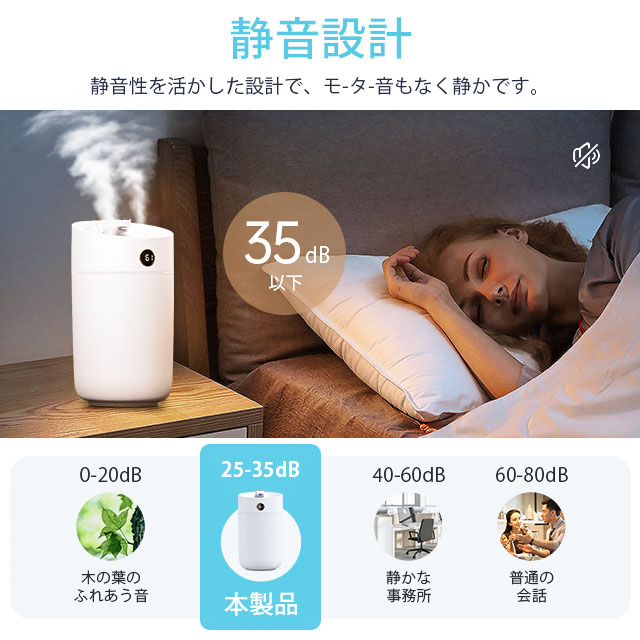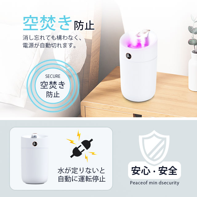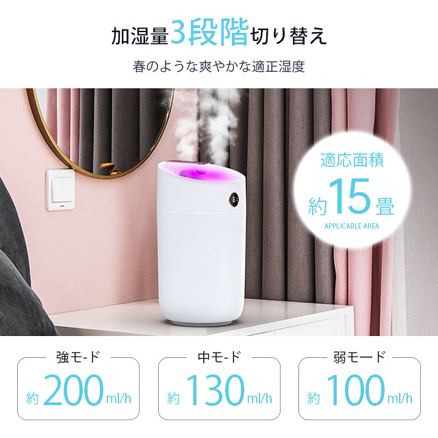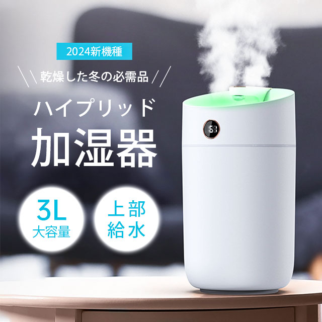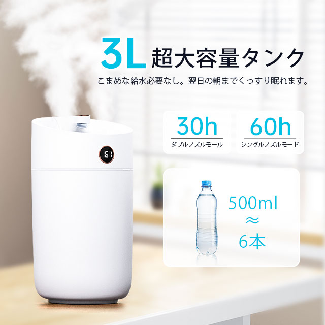 加湿器 超音波式 大容量 3L ダブルノズル加湿器 LEDライト付き 上部給水 3段階調節 焚き防止 静音 節電 省エネ エコ 軽量 卓上加湿器