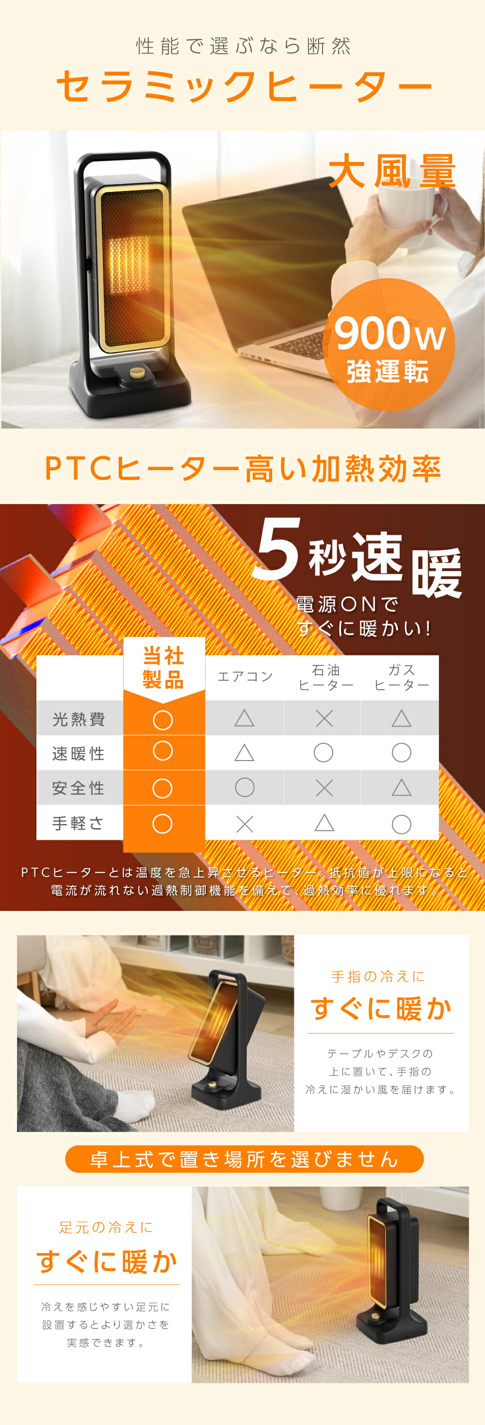 【すぐに暖かい】この冬、在宅時間を快適に過ごす!スイッチを入れればすぐに温風が出るため、立ち上がりを待たずに暖まることができます。テーブルやデスクの上に乗せて指先の冷えやかじかみに温かい風を。冷えを感じやすい足元に設置するとより温かさを実感できます。