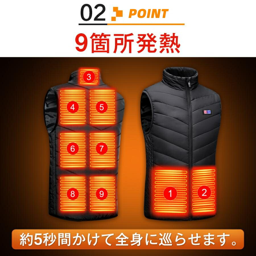 電熱ベスト モバイルバッテリー付き 9エリア発熱 ヒーターベスト バッテリー給電 5秒速暖 温度調整 水洗い可能 usb加熱 男女兼用 防寒ベスト 加熱服 前後独立