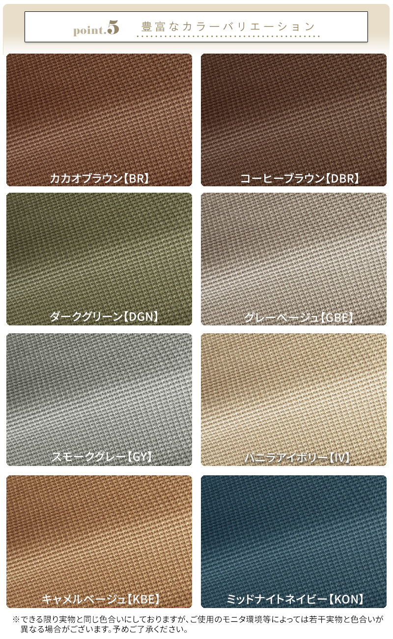 color: カカオブラウン【BR】 コーヒーブラウン【DBR】 ダークグリーン【DGN】 グレーベージュ【GBE】 スモークグレー【GY】 バニラアイボリー【IV】 キャメルベージュ【KBE】 ミッドナイトブルー【KON】