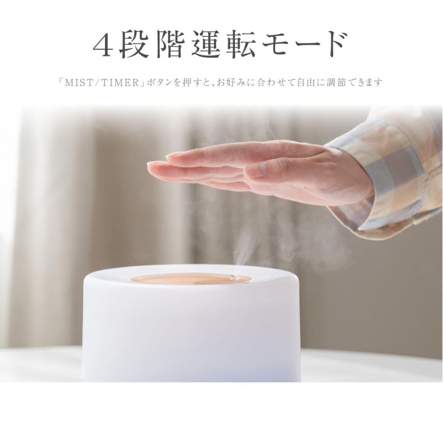 【3段階切り替えアロマ対応】加湿量3段階切り替え春のような爽やかな適正湿度。水溶性アロマ対応アロマの香り広がるリラックス空間に。お気に入りの香りと心地よい潤いに包まれてお休みください。