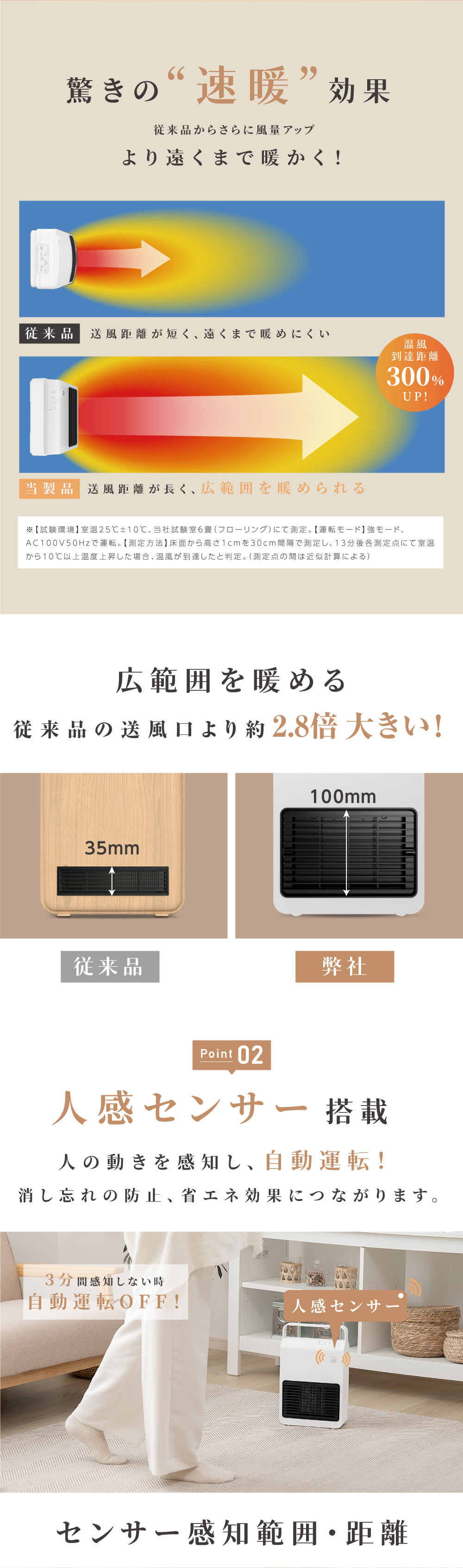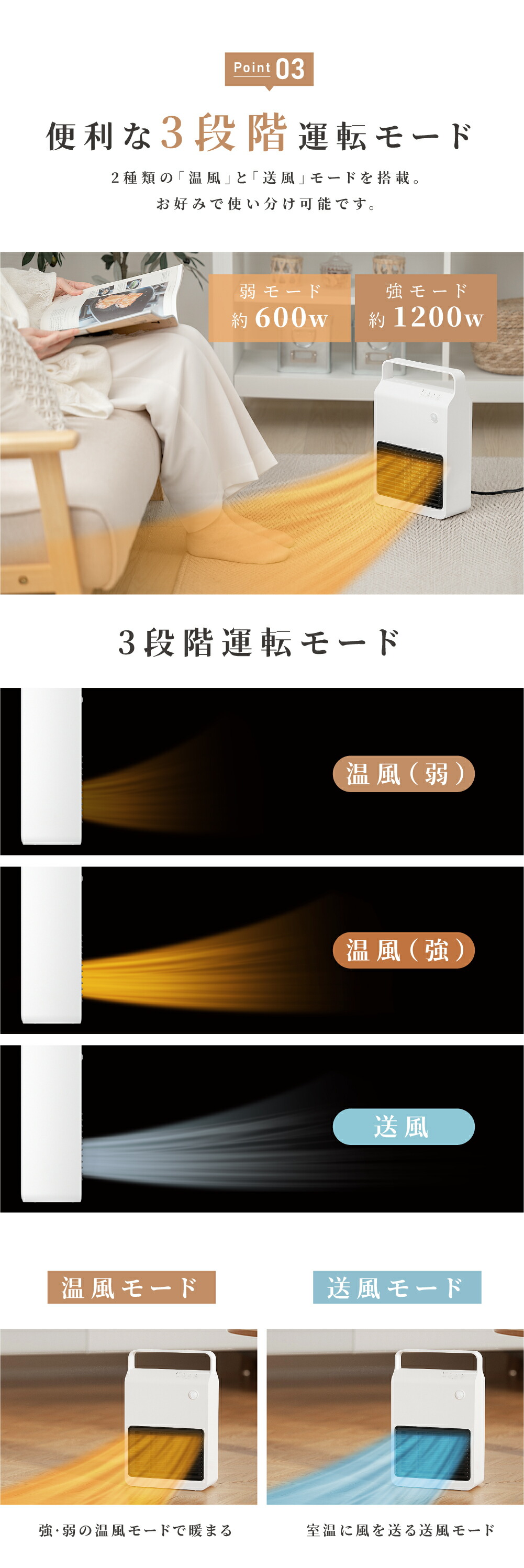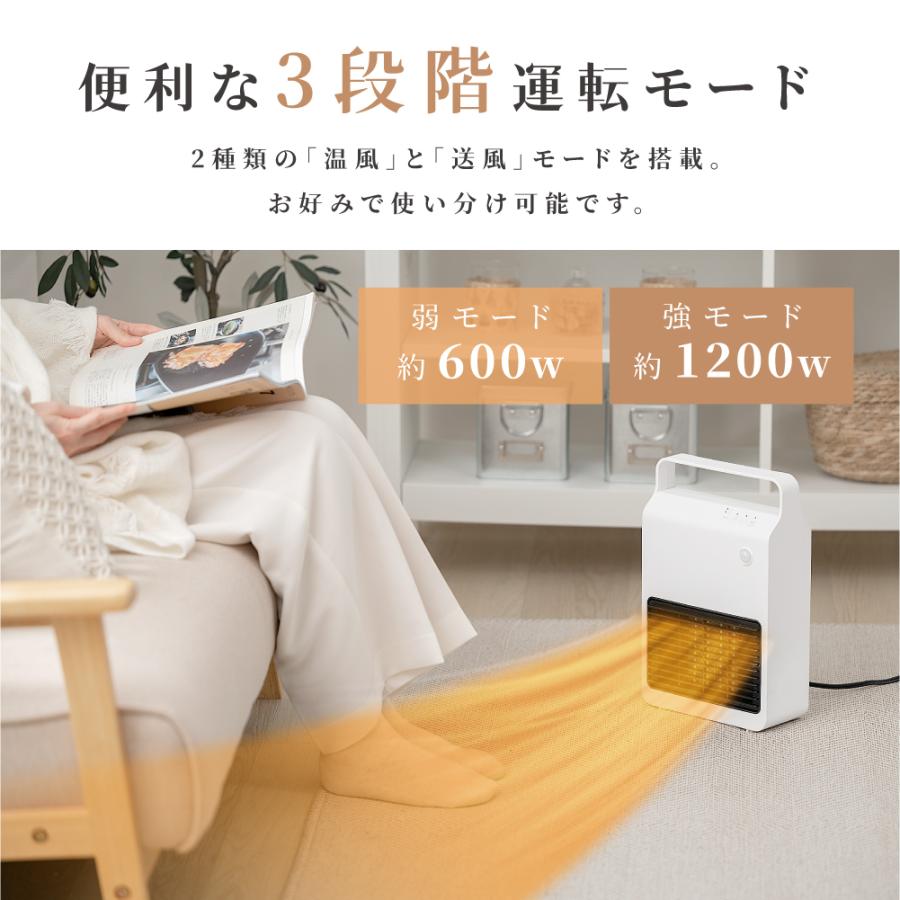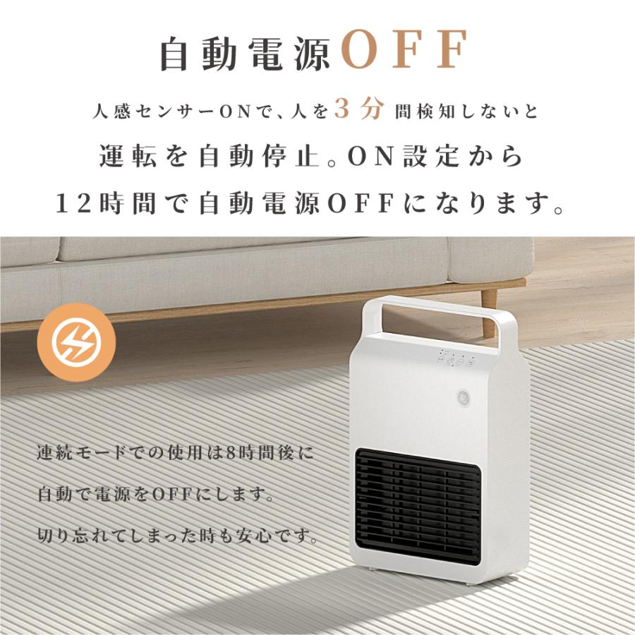 【3段階風量切り替え+人感センサー】本製品につきまして、送風(自然風)、温風(弱)、温風(強)の3種類送風モードにより、強モード(1200 W)と弱モード(600 W)があるので、様々なシーンによって自由にお好みの温度を設定できます。また、人感センサー機能により、人の動きを察知し。自動で運転することが可能です。さらに3分間感知しない時には、自動的にOFFし、8時間以上経つと、主電源が自動に切れるので、電気の無駄使いを防ぎます。