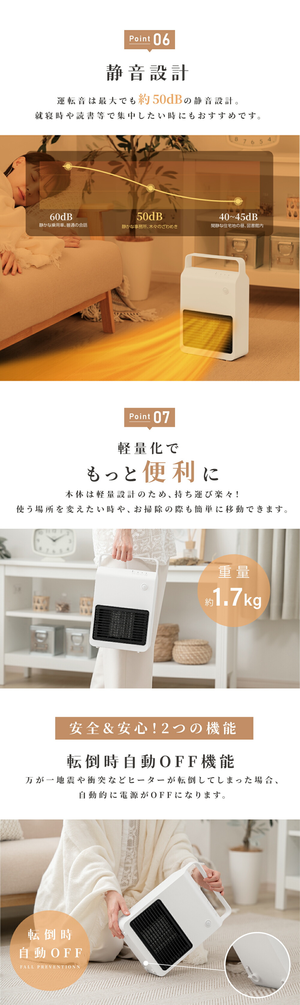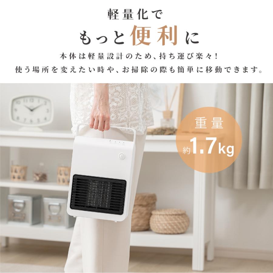 【スリムデザイン&操作簡単】本体は、約1.7kgの軽量設計。女性でも持ち運び楽々!掃除機をかける時も、楽に移動ができます。スイッチのオンオフはとても簡単で、本体上部にあるボタンを押すだけで簡単に操作できます。お年寄りにもわかりやすく、簡単に切り替えや、必要に応じての暖かさの調節ができます。電源線の長さは1.2mでコンセントから離れていても使えます。