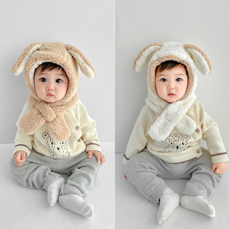 帽子部分をかぶるだけで簡単に着用できます。また、マフラー部分も輪っかに通すだけで調整可能です。お子様自身でも簡単に着脱できるため、お出かけ時の準備もスムーズです。