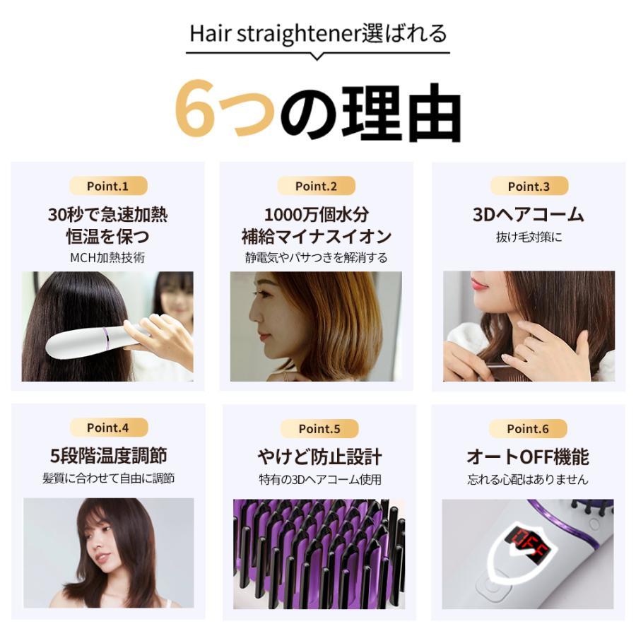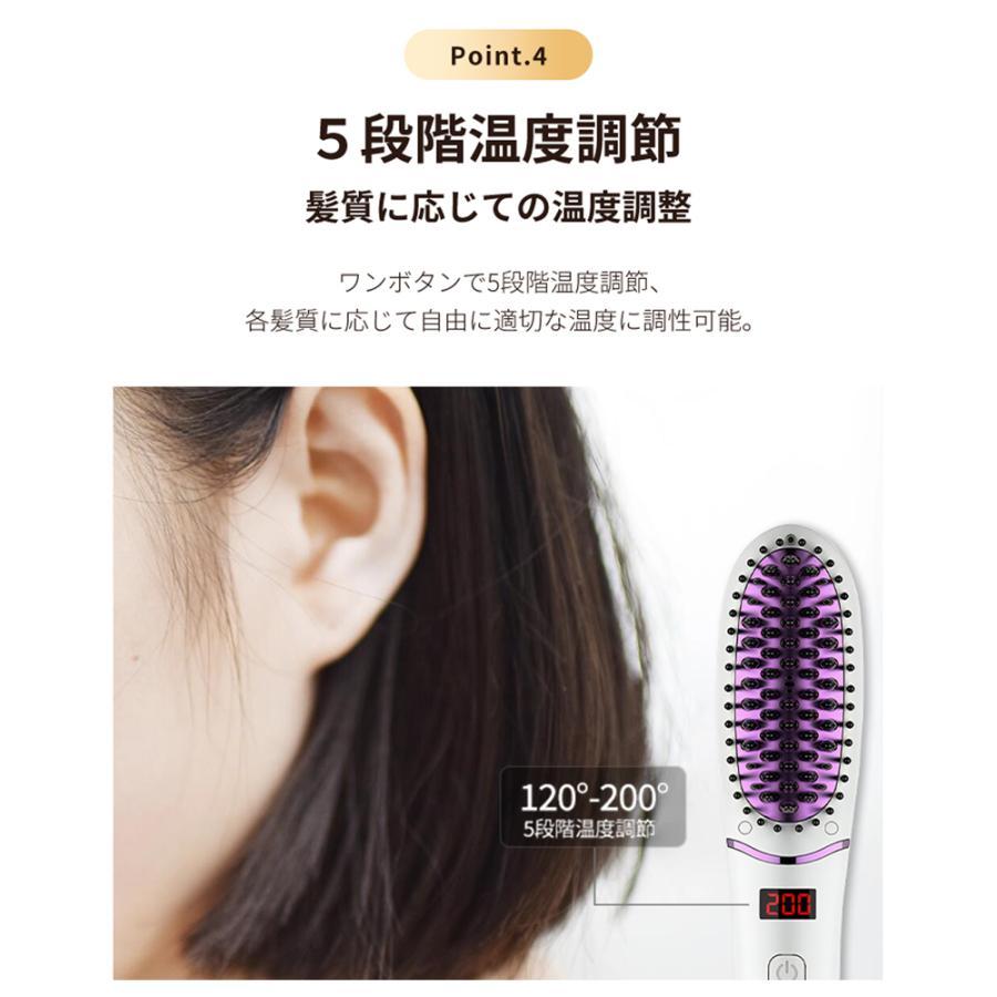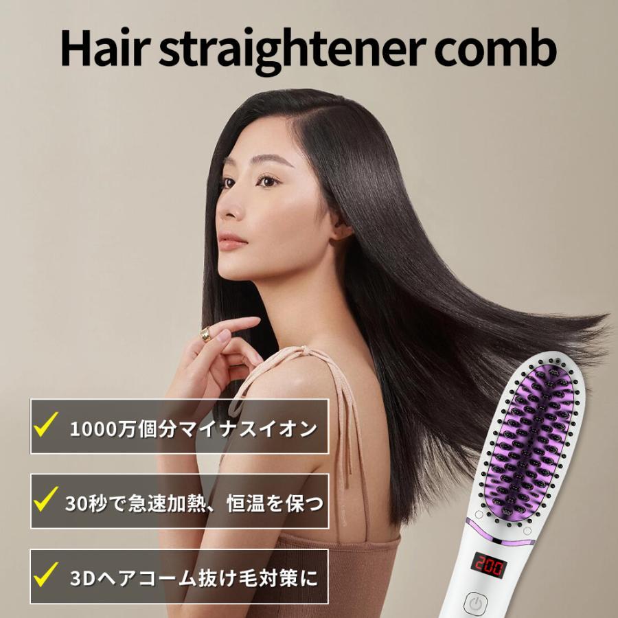 1.【5段階温度調整30秒急速加熱】:5段階温度調節可能なストレートブラシは、髪質に合わせて120℃/140℃/160℃/180℃/200℃にお好みに設定できます。ワンボタン操作で温度を調整できてとても使いやすいし、あっという間にご希望の温度に加熱でき、急いでいる時も焦らず使用できます。静電気を抑えるマイナスイオンとの相乗効果で、つやのあるサラサラな髪を保ちます。