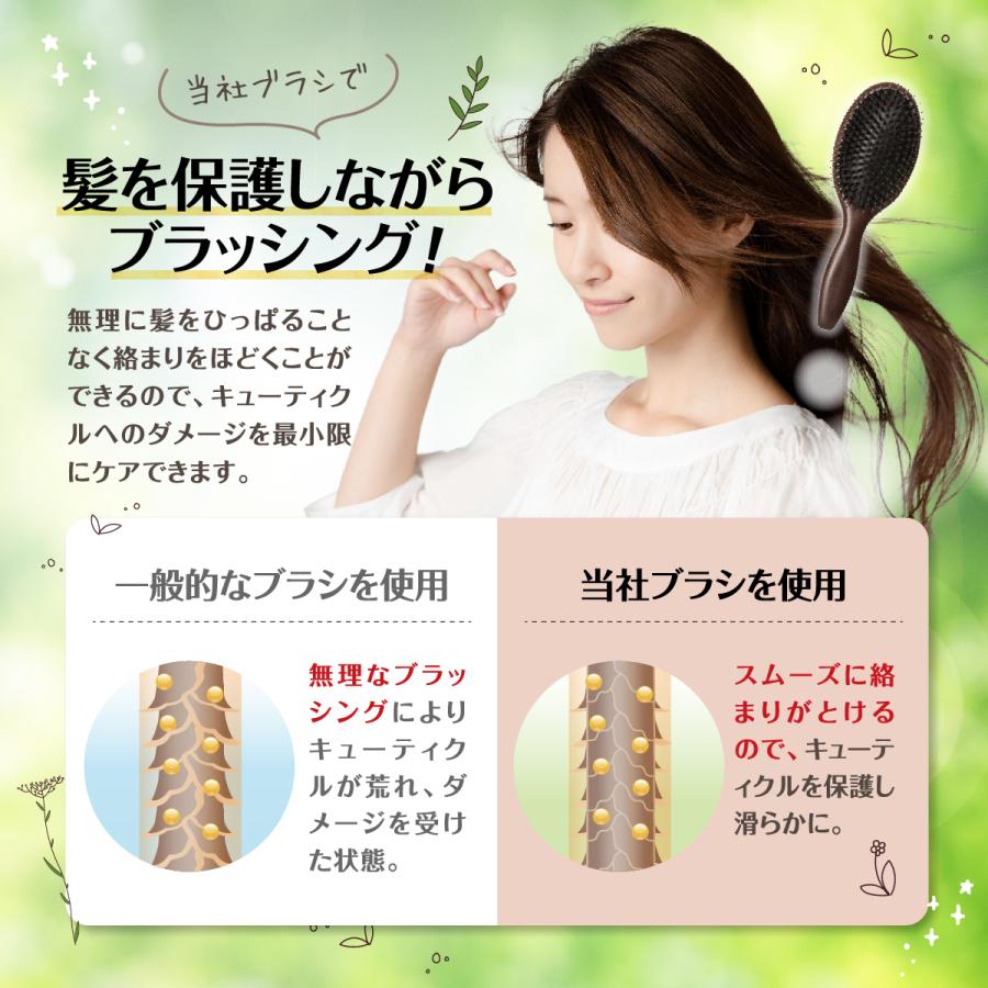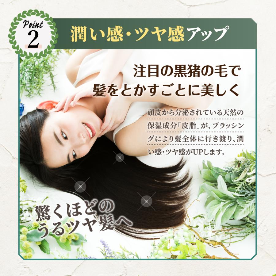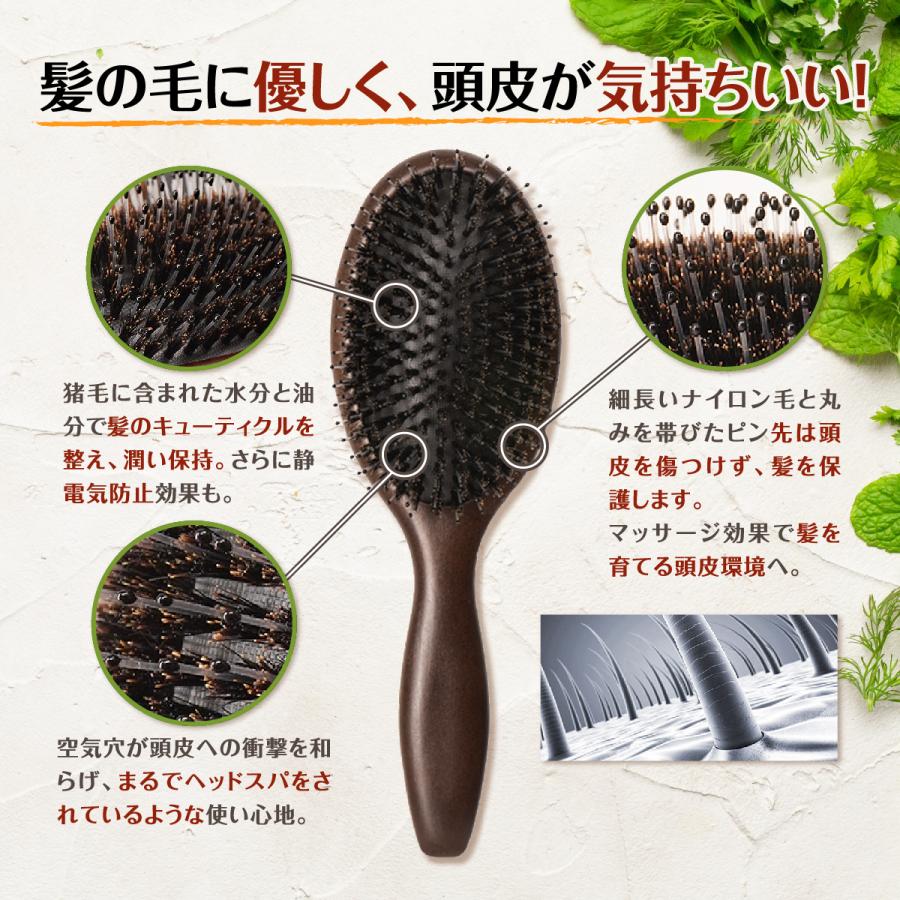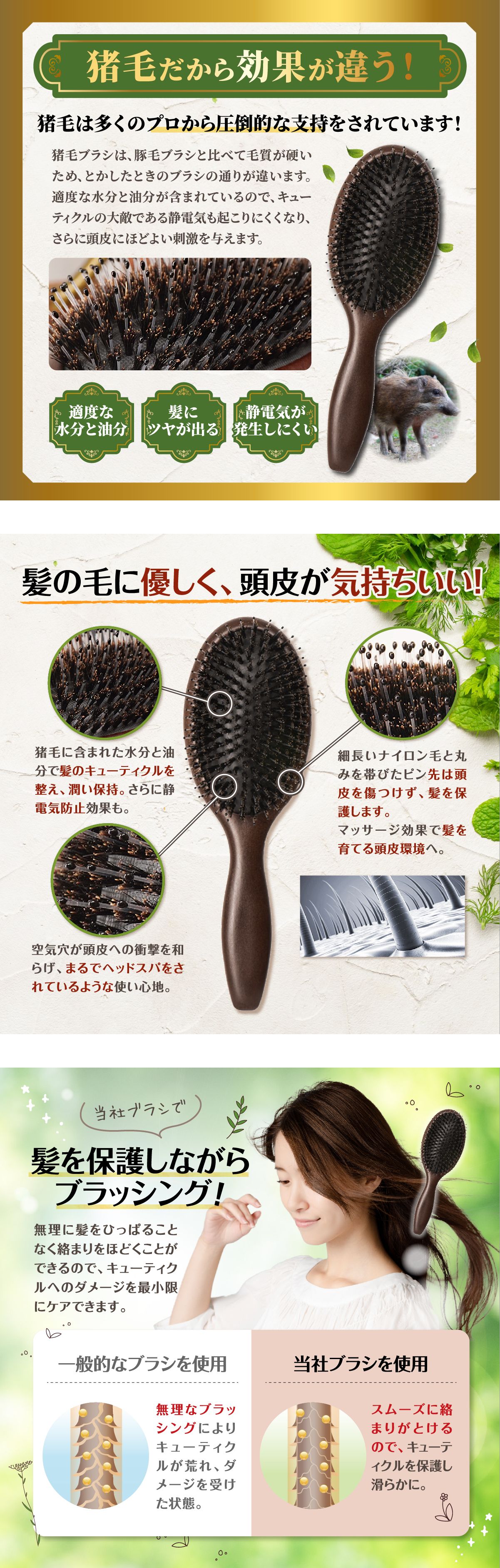 猪毛に含まれた水分と油分で髪のキューティクルを整え、静電気を防止しながら、まとまりやすい美しい髪に仕上げます。