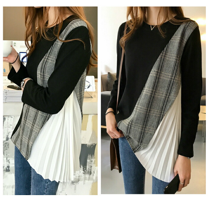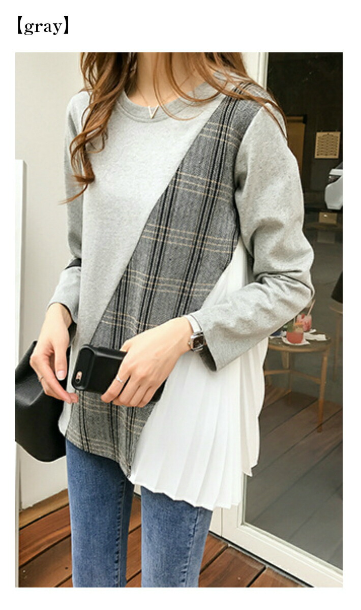 無地×チェック×プリーツ☆異素材 ドッ