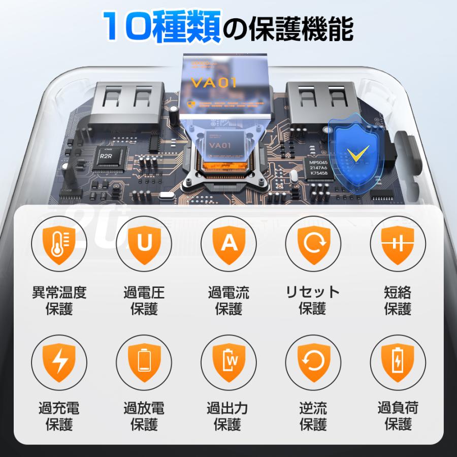 急速充電技術がさらに進化、高精度高安定度の出力電圧、出力電流を制御の活用により高効率充電を達成しました。従来のUSB Aポート出力に加え、入力出力に対応したUSB Type-Cポートを搭載しております。