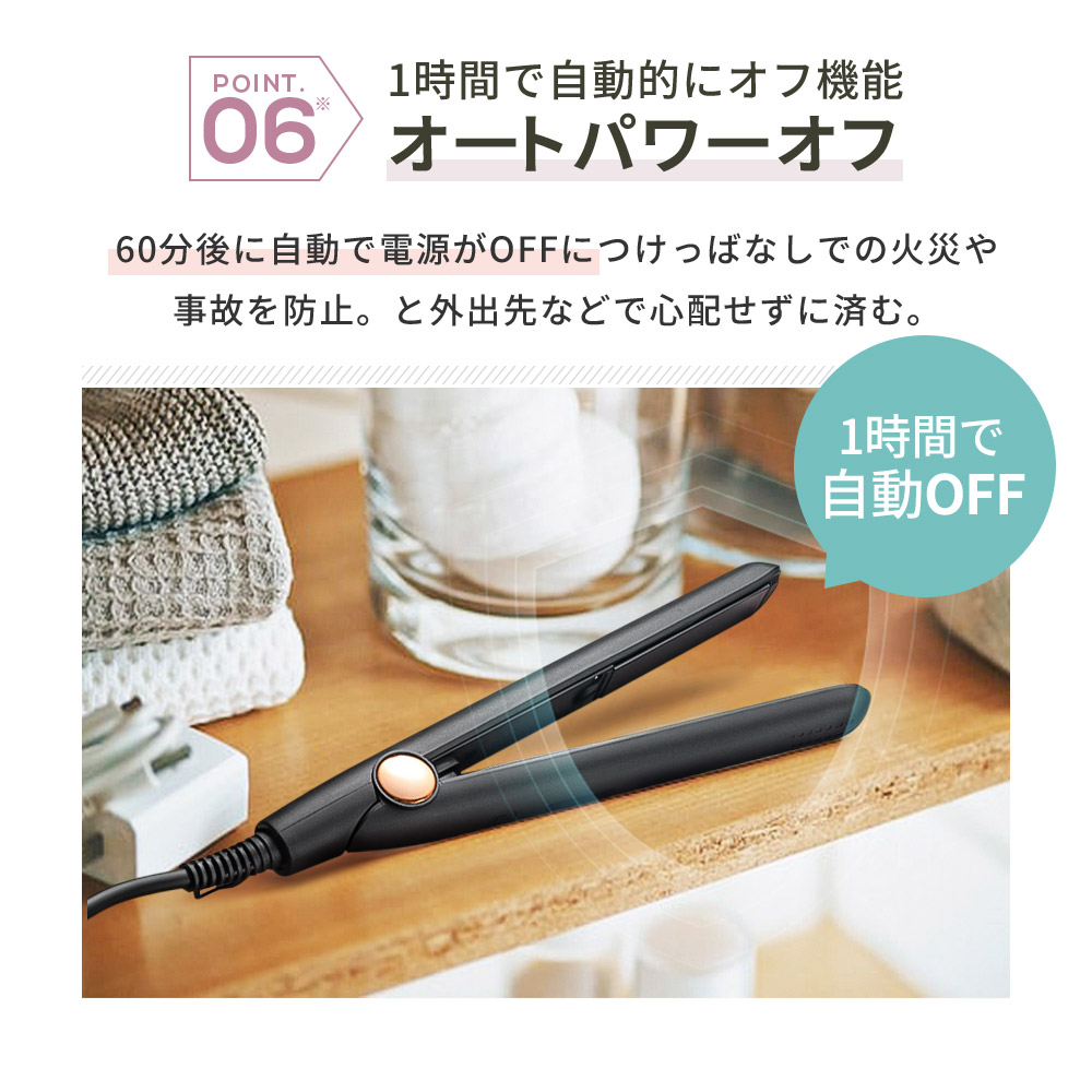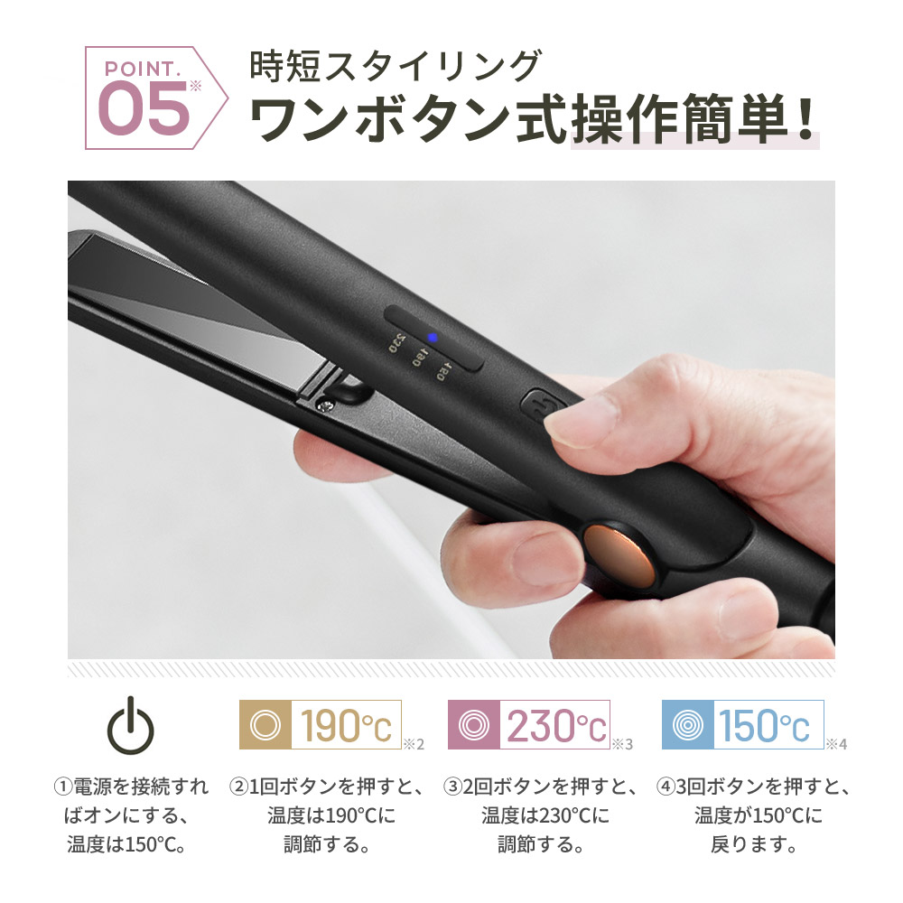 片手で温度調整150°C~230°Cの温度設定が可能です。素早く設定温度が上がり忙しい朝に役立ちます。ダイヤル式温度設定なので、どなたでも簡単に使用できます。