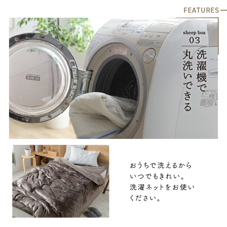 お洗濯の際は10kg以上用の洗濯機を使用するか、手洗いを行ってください。多少の色落ちや毛羽落ちが考えられ ますので単独にてお洗いください。