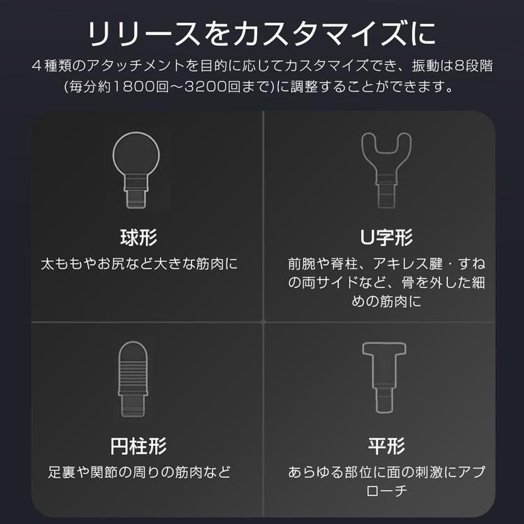 【4種類のマッサージヘッド】 マッサージガンは筋肉を活性化し、血流を刺激し、筋肉の回復時間を大幅に短縮し、痛みを和らげ、一度マッサージして、長い間リラックスすることができます。
