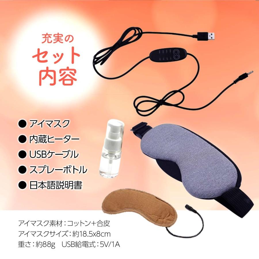 アイマスク、内蔵ヒーター、USBケーブル、スプレーボトル、日本語説明書
