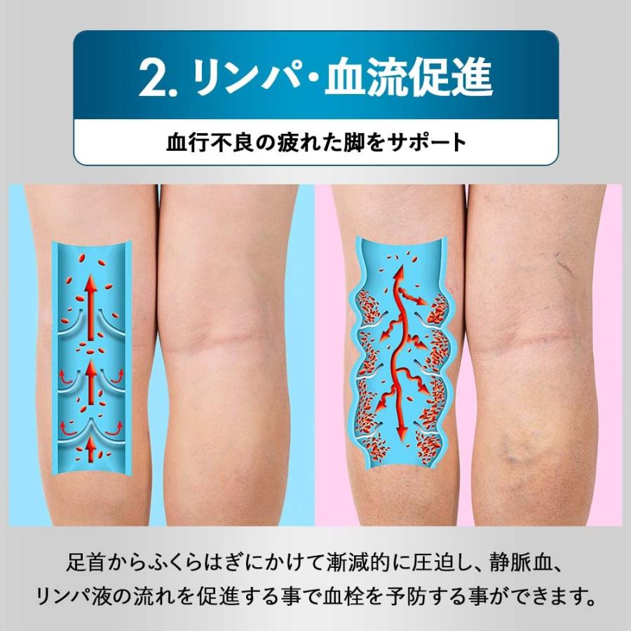 抹消から中枢に向かい段階的に圧力を軽減して、静脈血やリンパ液のうっ滞を軽減し静脈還流を促進することで、脚のむくみを軽減します。