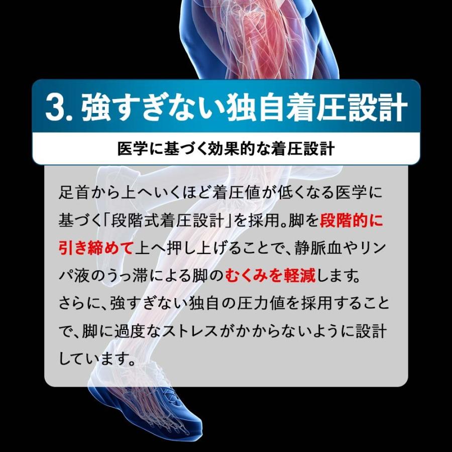 足首から上へいくほど着圧値が低くなる「段階圧力設計」を採用。
