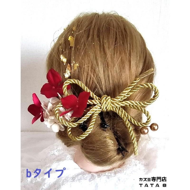 髪飾り 成人式 振袖 結婚式 卒業式 袴 プ 着物 和装 ウェディングドレス ヘッドドレス へアドレス パール 和紐 金箔 8点セット(シャンパン/赤/ゴールド)83s