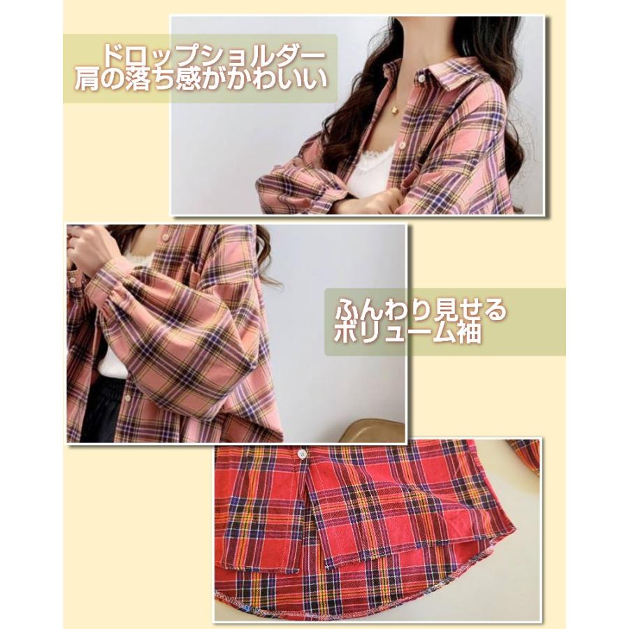 チェックシャツ レディース ロング ピンク レッド 赤 イエロー 長袖 チェック柄 シャツ オーバーサイズ トップス ゆったり 大きいサイズ 体型カバー 韓国