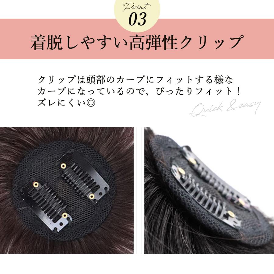 「簡単装着!」2つのクリップでパチンと留めて、専用コームで地毛に馴染ませるだけ♪ 気になる白髪や頭頂部がツヤツヤふんわりボリュームアップし、簡単に自然なおしゃれヘアに変身!頭部にしっかりフィットするよう、クリップはカーブしているのでしっかり固定できてズレにくい!