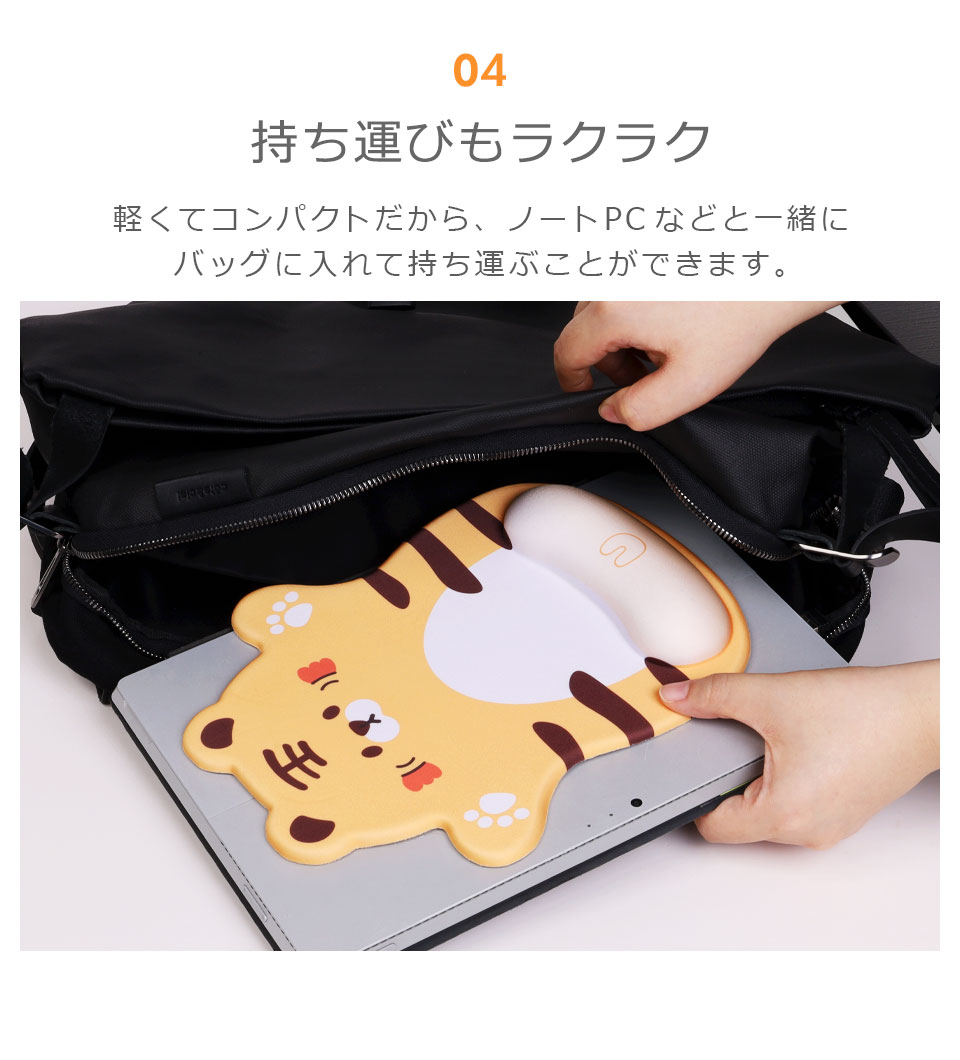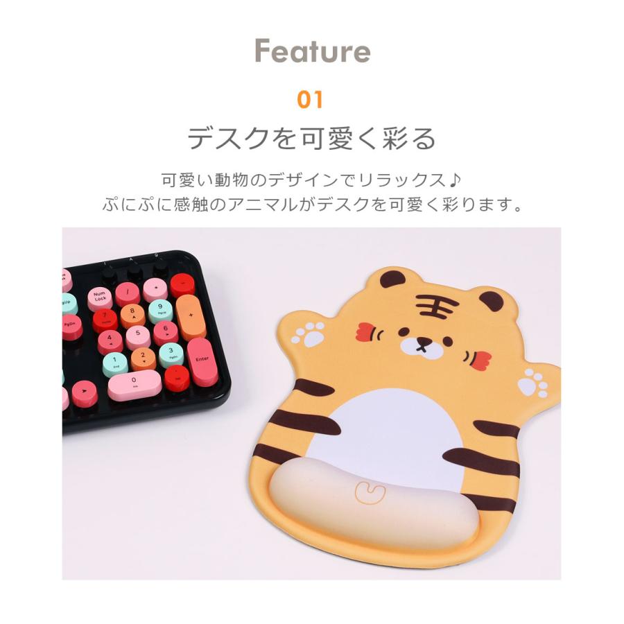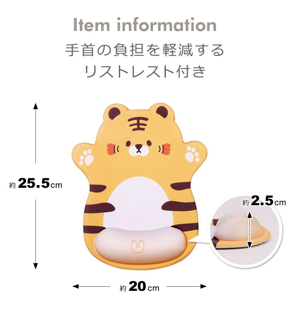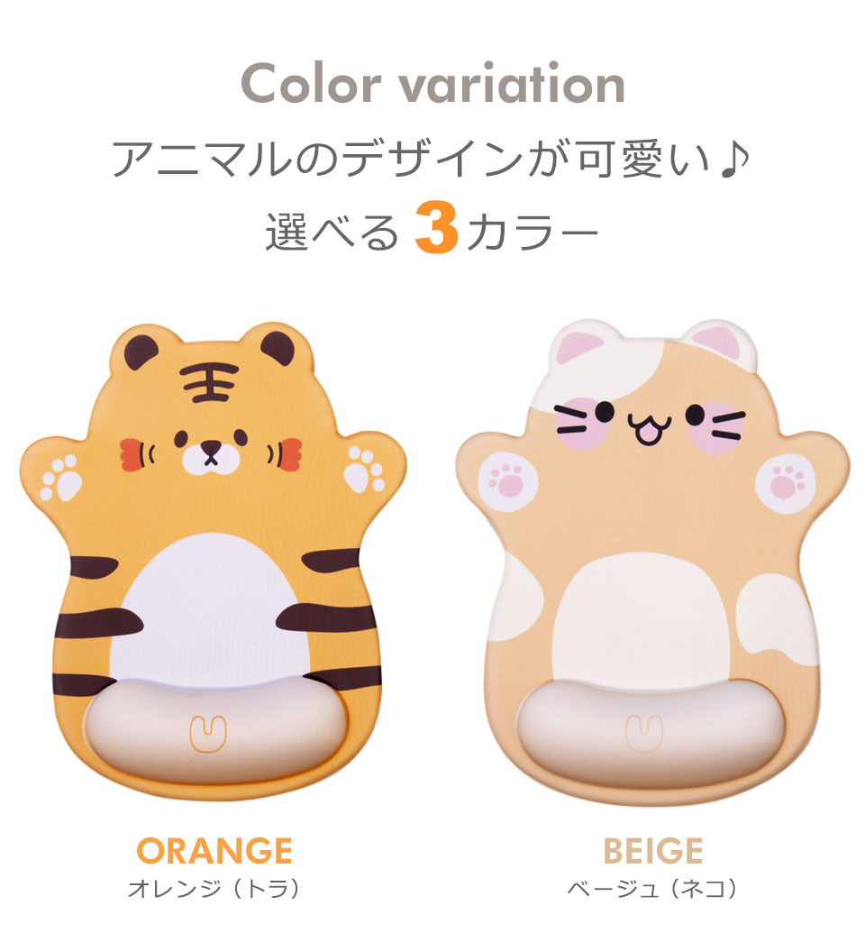タイプ リストレスト付きマウスパッドカラー オレンジ(トラ)、ベージュ(ネコ)、ピンク(ネズミ)サイズ 約20cm×約2.5cm×約25.5cm素材 シリコン、ポリウレタン重量 約220g商品について 【手首の負担を軽減するリストレスト付きのかわいいマウスパッド】