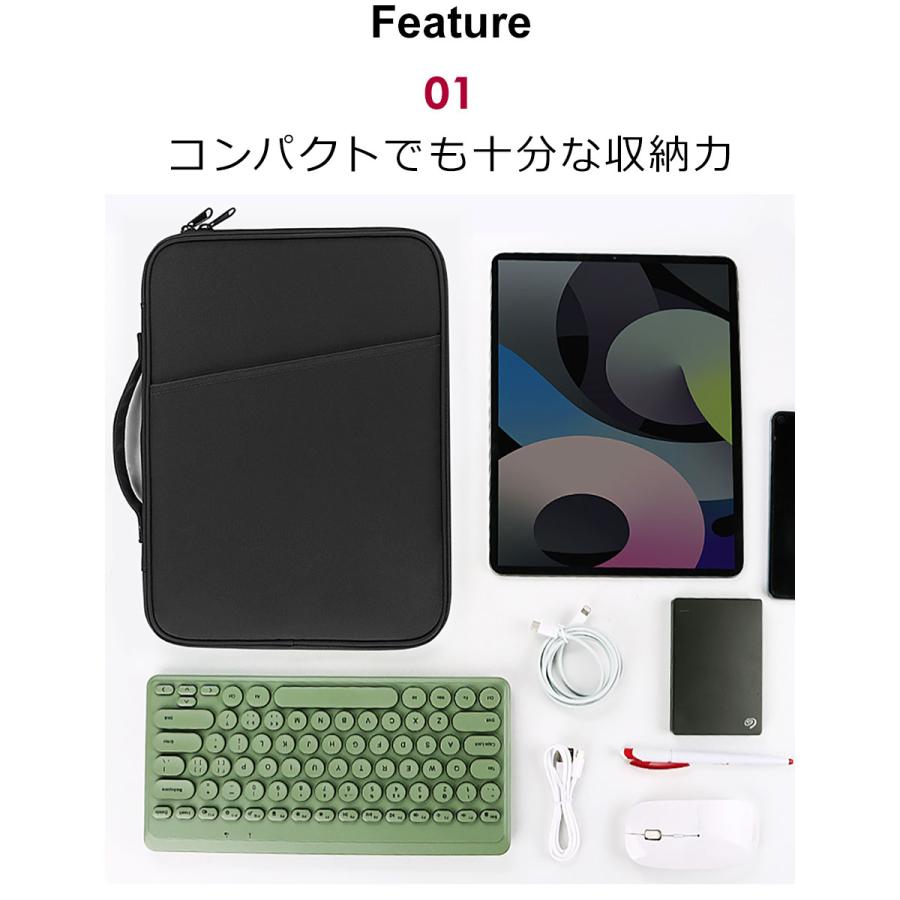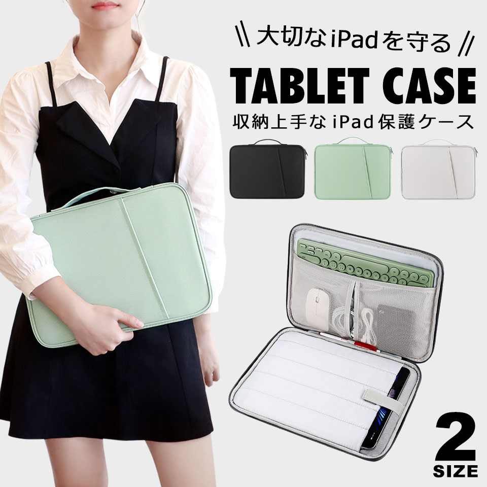 タイプ タブレットケース(iPadケース)カラー ブラック、グリーン、ホワイトサイズ 10.8~11インチ(約30cm×約23cm×約3cm)、12.9~13インチ(約35cm×約25.5cm×約3cm)素材 ナイロン重量 10.8~11インチ/約190g、12.9~13インチ/約240g商品について 【大切なiPadやタブレットを汚れや衝撃から守るタブレットケース】
