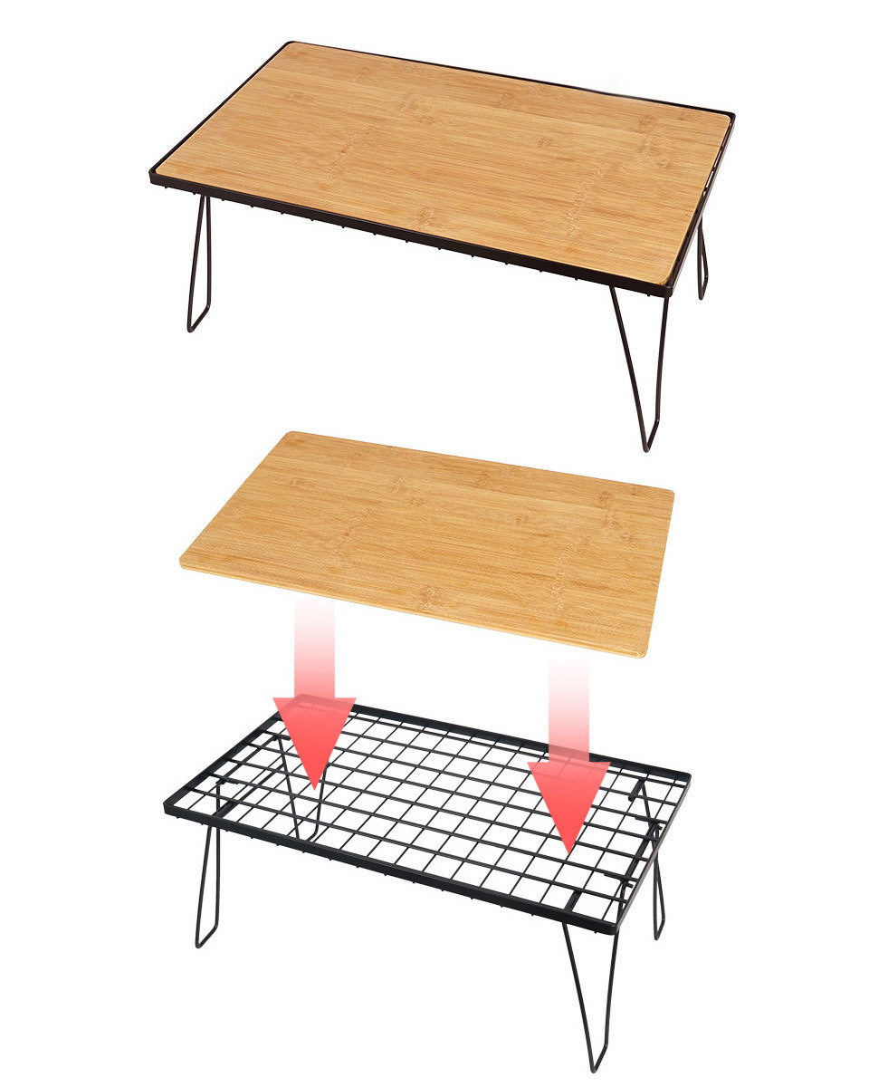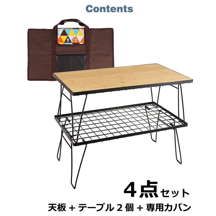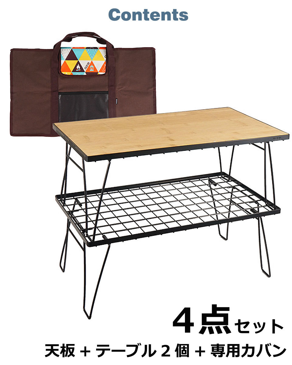 メッシュテーブル×2台、竹製の天板×1枚、収納バッグ×1個の4点セット。メッシュテーブル2台を重ねて、上段のテーブルに天板をセットして使います。もちろん、バラバラに使うこともできて、レイアウトは自由自在で、いろいろなパタンの使い方が出来るアウトドアメッシュテーブルです。