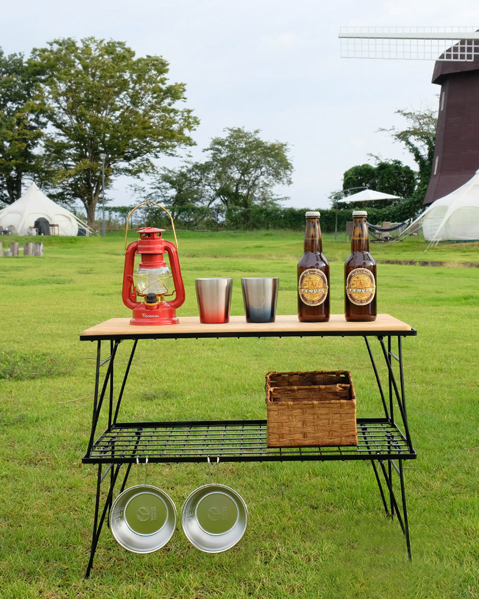 上下に重ねて使えばテーブルラックになります。下段を収納ラックとして使えるので、サイトをスッキリと使うことが出来るアウトドアメッシュテーブルです。