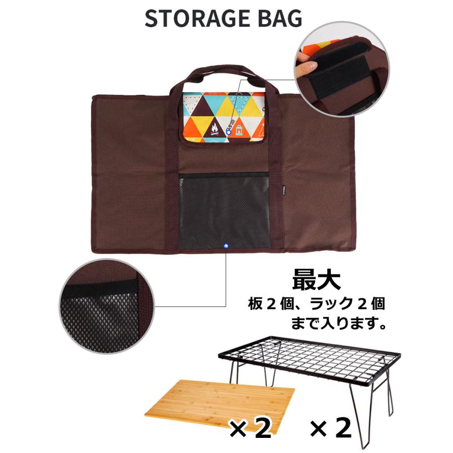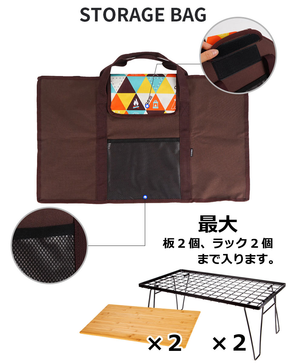 天板×2枚、テーブル2台まで入る、専用の収納バッグ付きなので、持ち運びにも便利なアウトドアメッシュテーブルです。