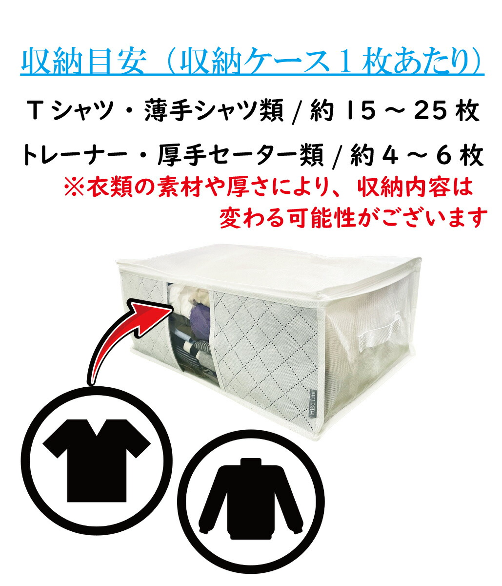 収納目安(1枚あたり) Tシャツ/シャツ類 約15~25枚トレーナー/セーター類 約4~6枚 (収納する衣類の厚みにより収納量は変わります)